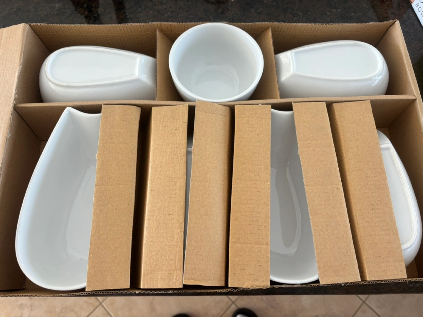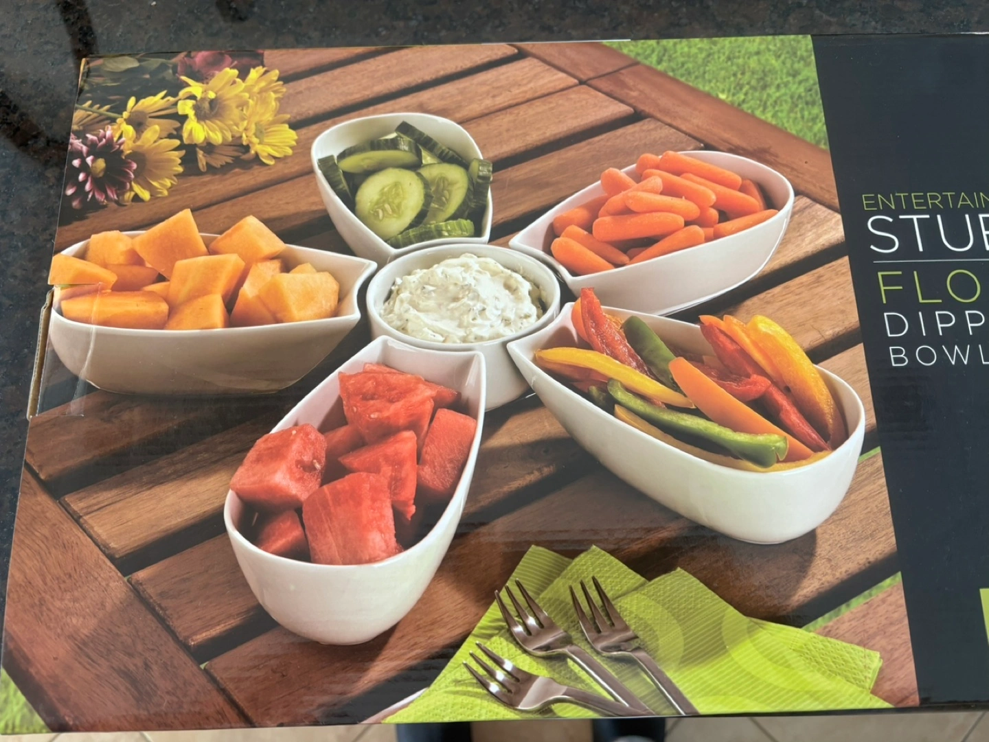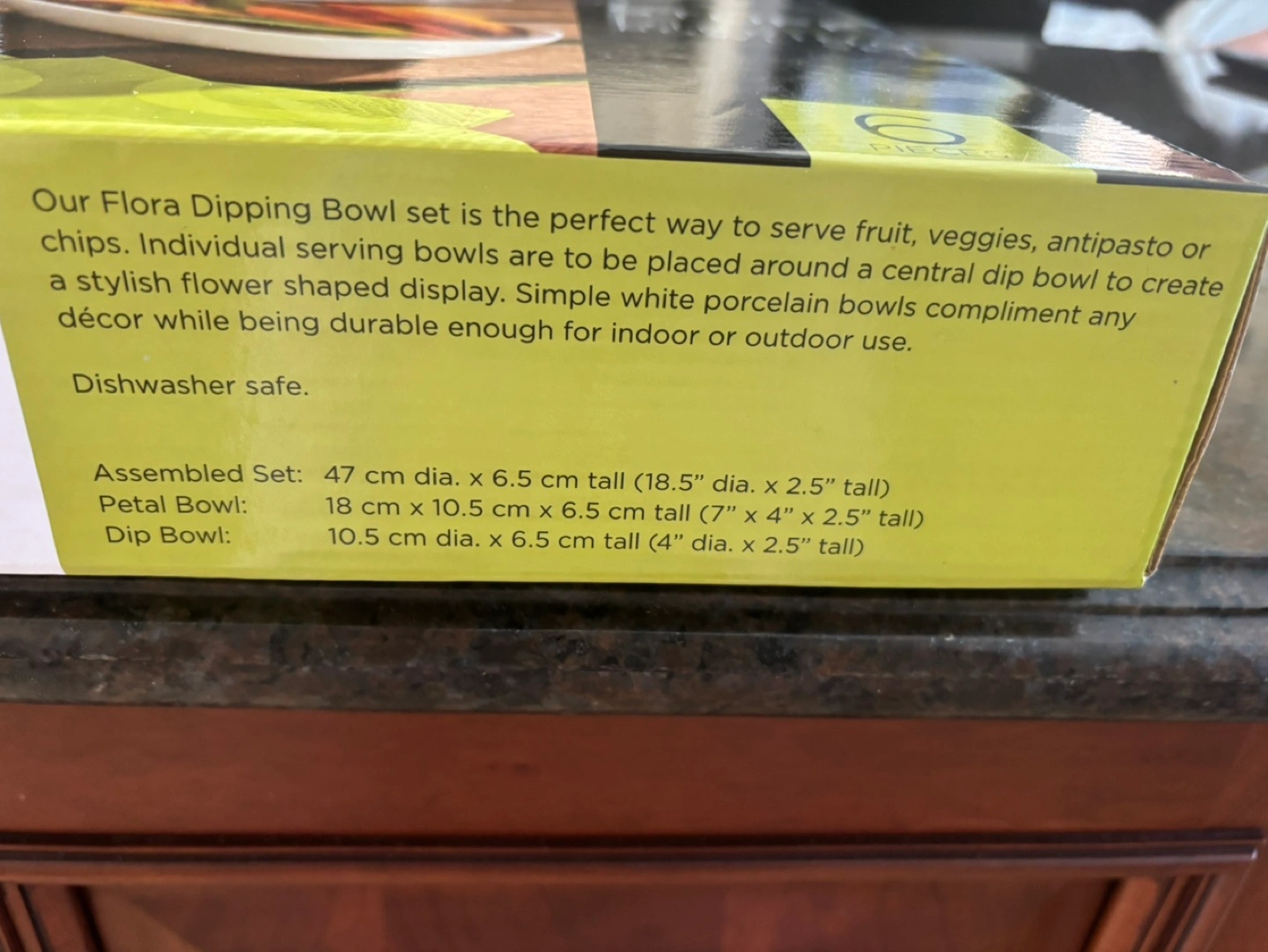 See pics for measurements. New, still in original box. Petal shaped porcelain serving pieces for fruit, veg, chips, nuts etc. Durable white ceramic . Giftable. Individual pieces are stackable. 2 sets available. PU 2 km N of Hwy 401 & Weston Rd. (Weston & Sheppard) Toronto No holds. Cash only.