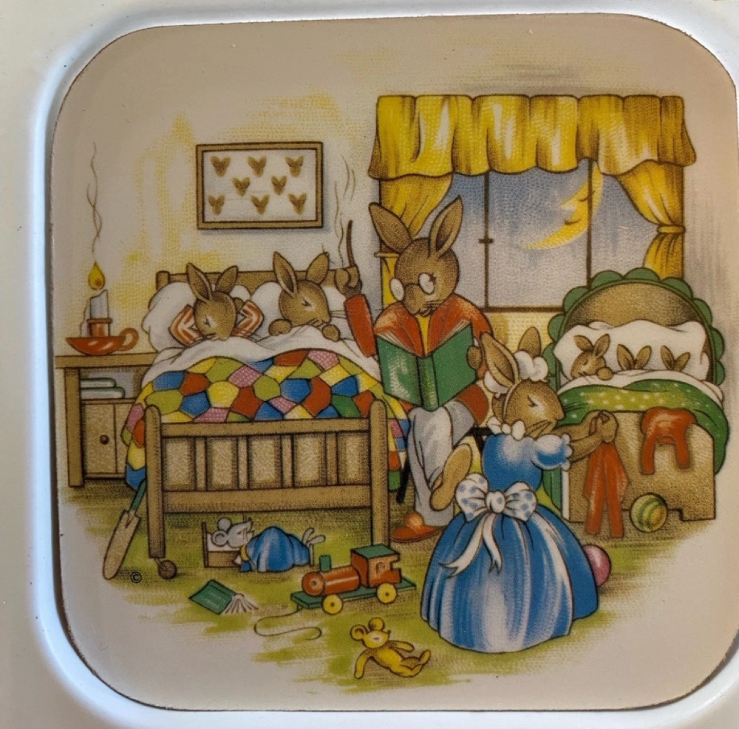 🤩Bunnykins🐰 by Royal Doulton RARE/HARD TO FIND ~ VINTAGE COASTERS! Set of 4 with adorable classic Bunnykins scenes🤗💖 ❣️NEVER USED! EXCELLENT VINTAGE CONDITION! With original packaging but it is no longer sealed (there is a crack in the plastic holder but the coasters are in mint condition!) $45 OBO