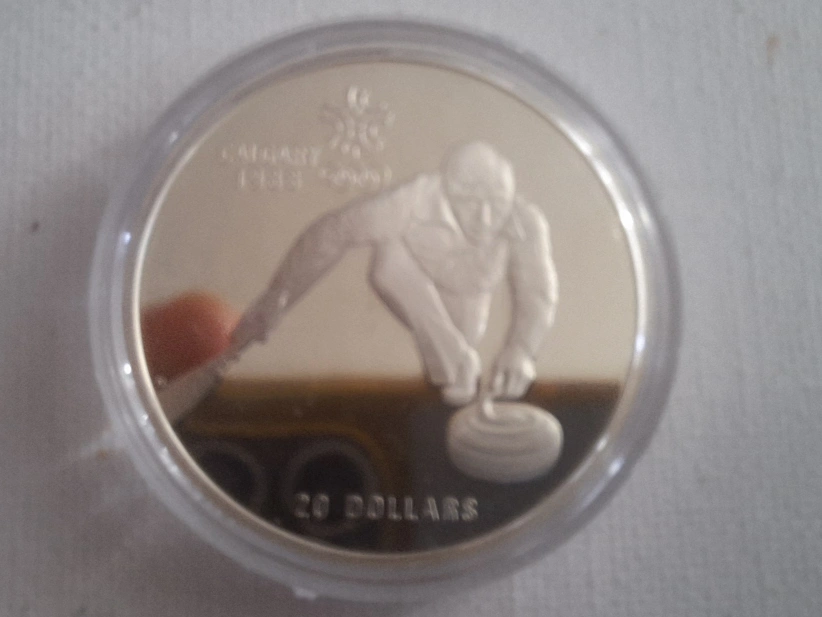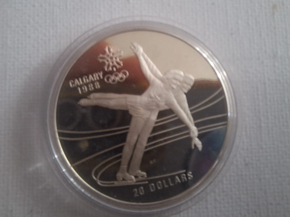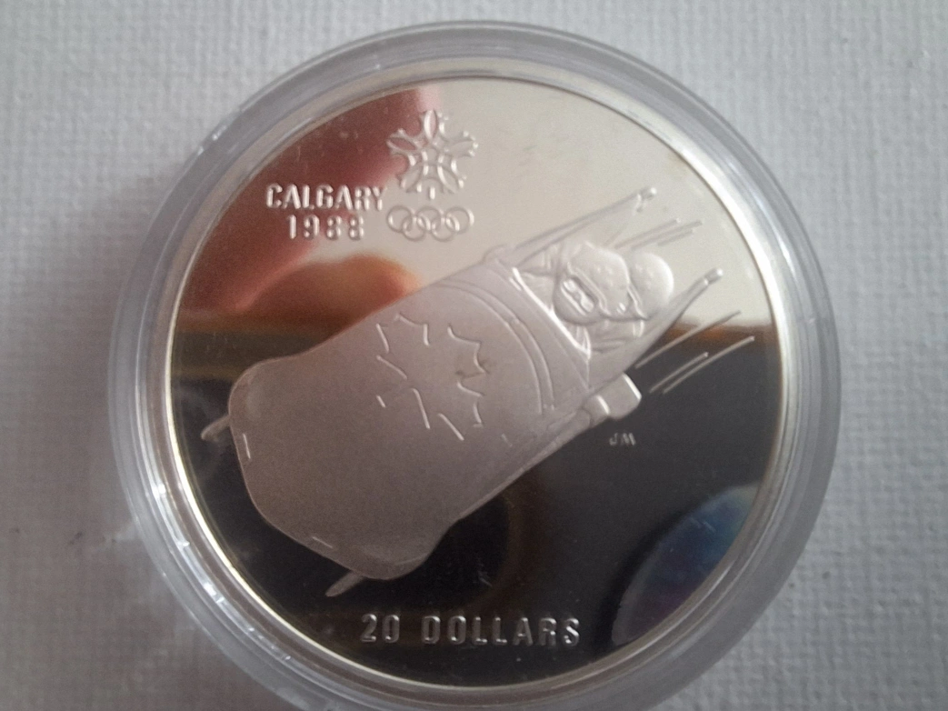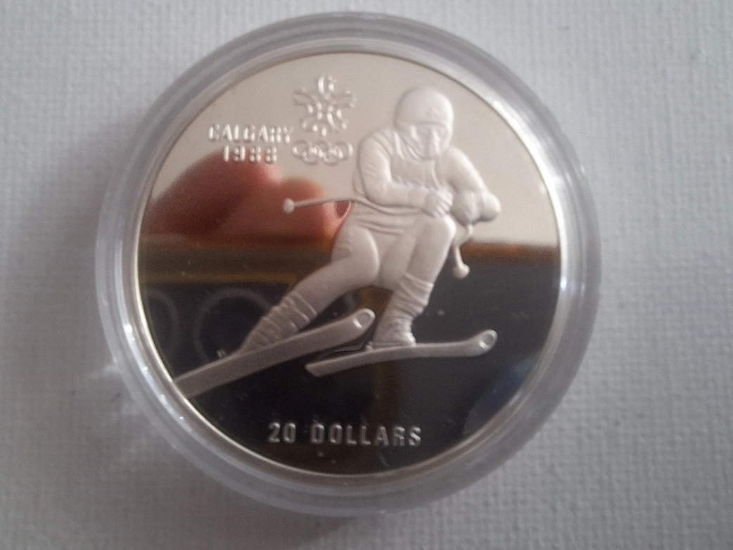 Collection of nine $20 silver coins. Each coin features a different winter sport. Calgary 1988 Olympic logo present. Comes in individual plastic cases. Sterling Silver Each coin contains 1 oz pure silver 31.1 grams $75 more than 1 $70 each