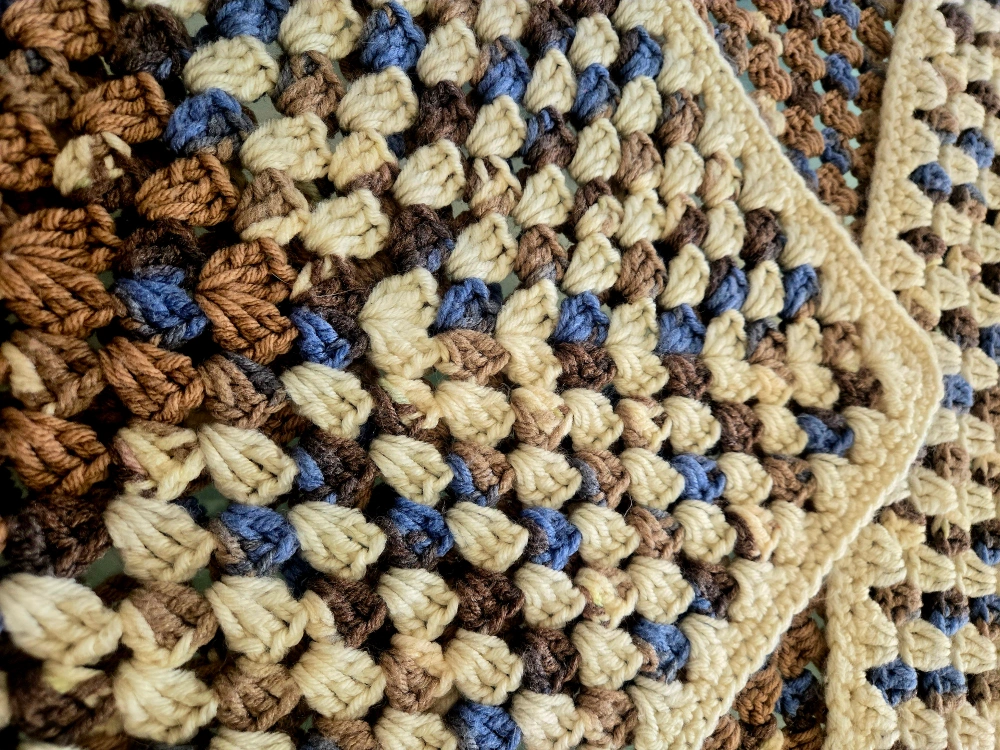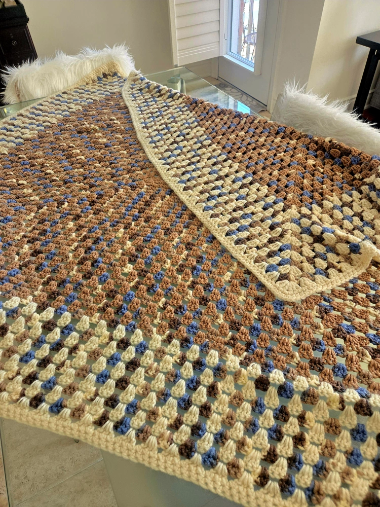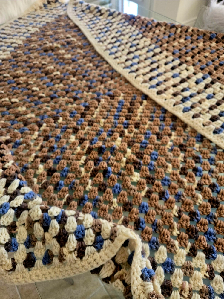 Beautiful handmade crochet throw. Features a textured pattern in earth tones. Perfect for adding warmth and style to your living space. Soft and cozy.
