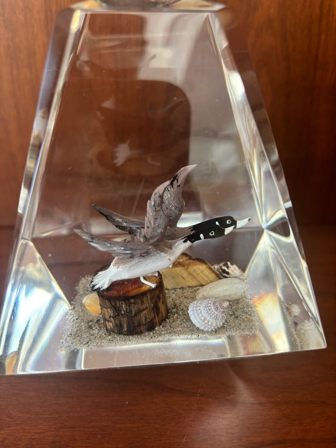 Proudly display this vintage lucite paperweight with Canada geese nesting on wooden discs surrounded by sand and shells. 5”H x 4” W In excellent condition other than a couple light scratches on one side. Pictures show reflections. PU 2 km N of Hwy 401 & Weston Rd. (Weston & Sheppard ) Toronto No holds. Cash only