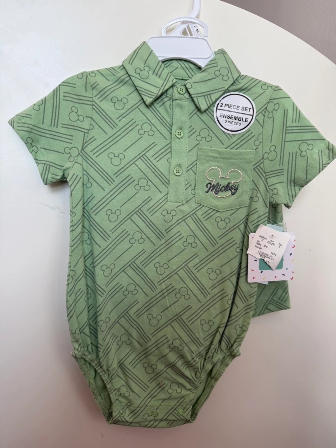 Adorable sage green Mickey Mouse baby outfit. Two-piece set, features a short-sleeve polo bodysuit and matching pants. Cute Mickey Mouse print.
