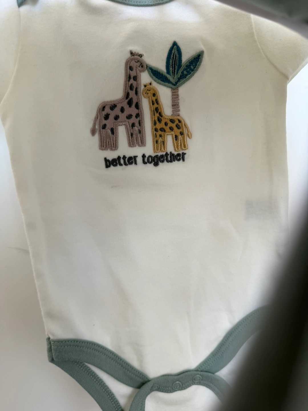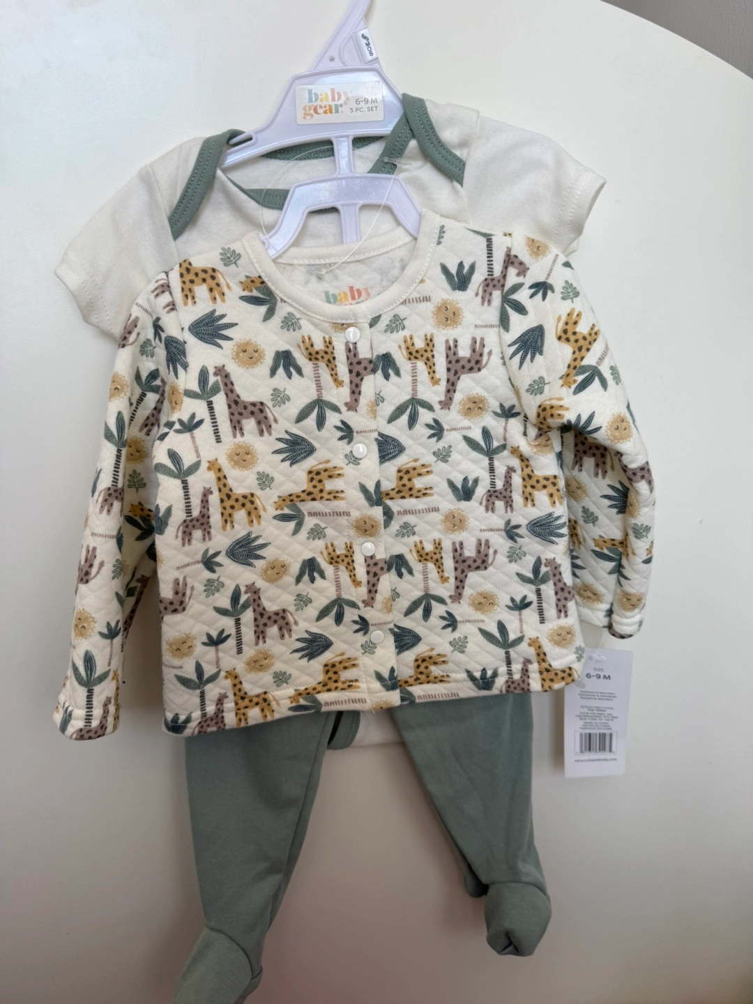 Adorable baby outfit, 3-piece set. Features a quilted jacket with safari animal print, two bodysuits, and a pair of pants. Size 0-3 months. New with tags.