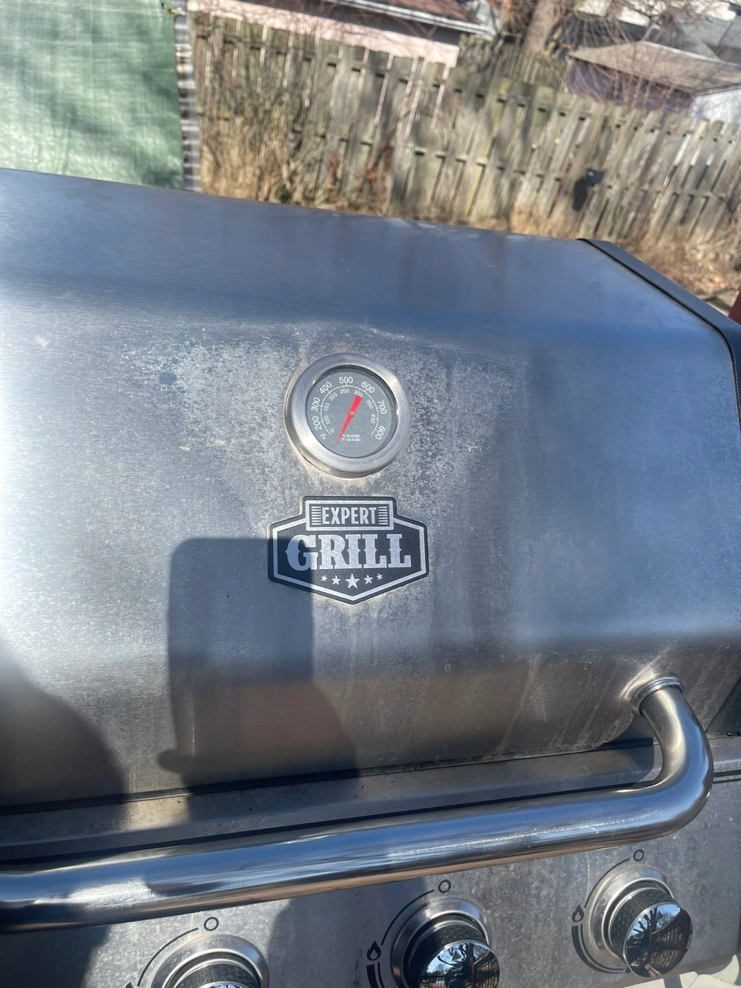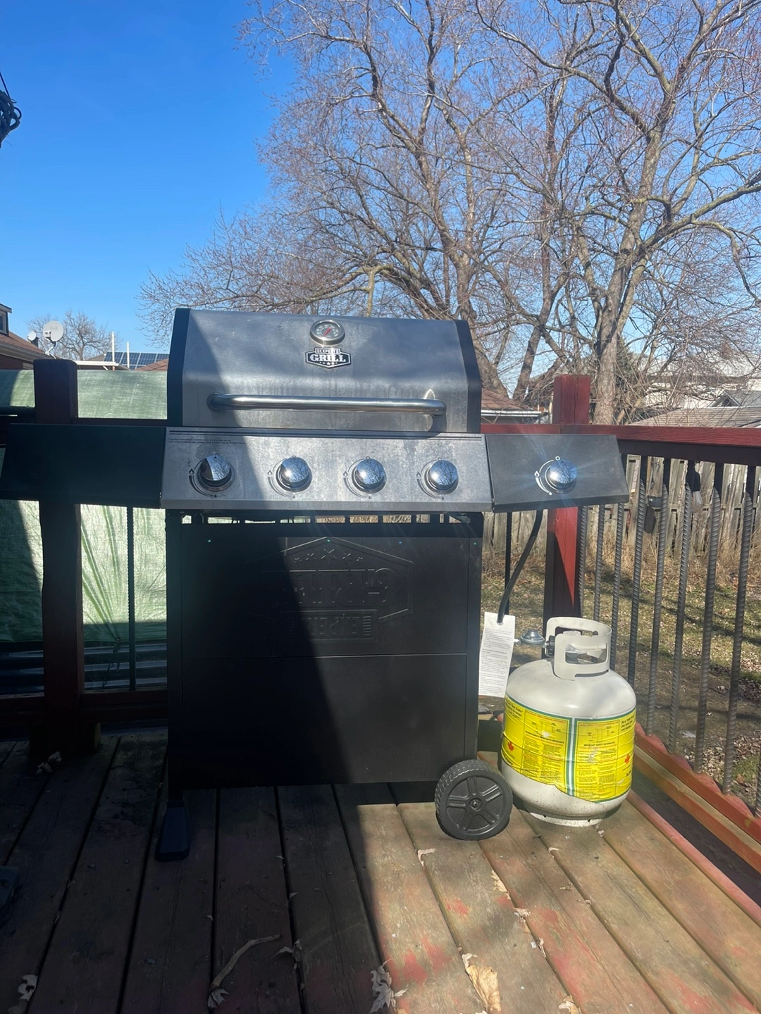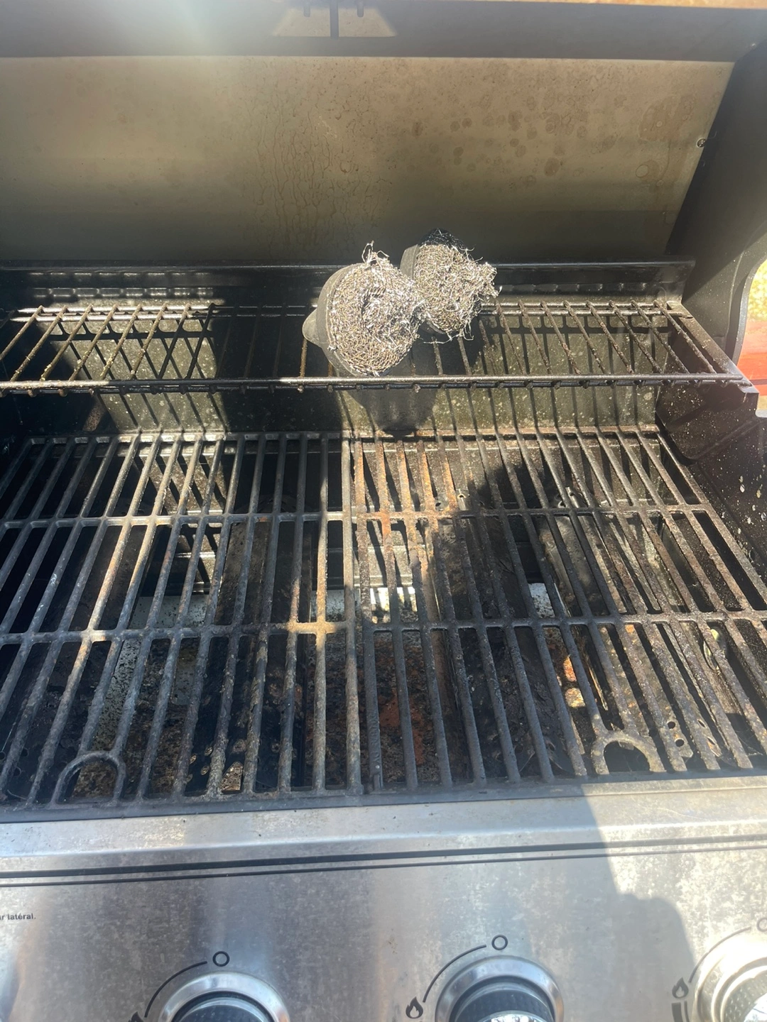 Four-burner propane BBQ. Stainless steel exterior. Used condition; requires cleaning.