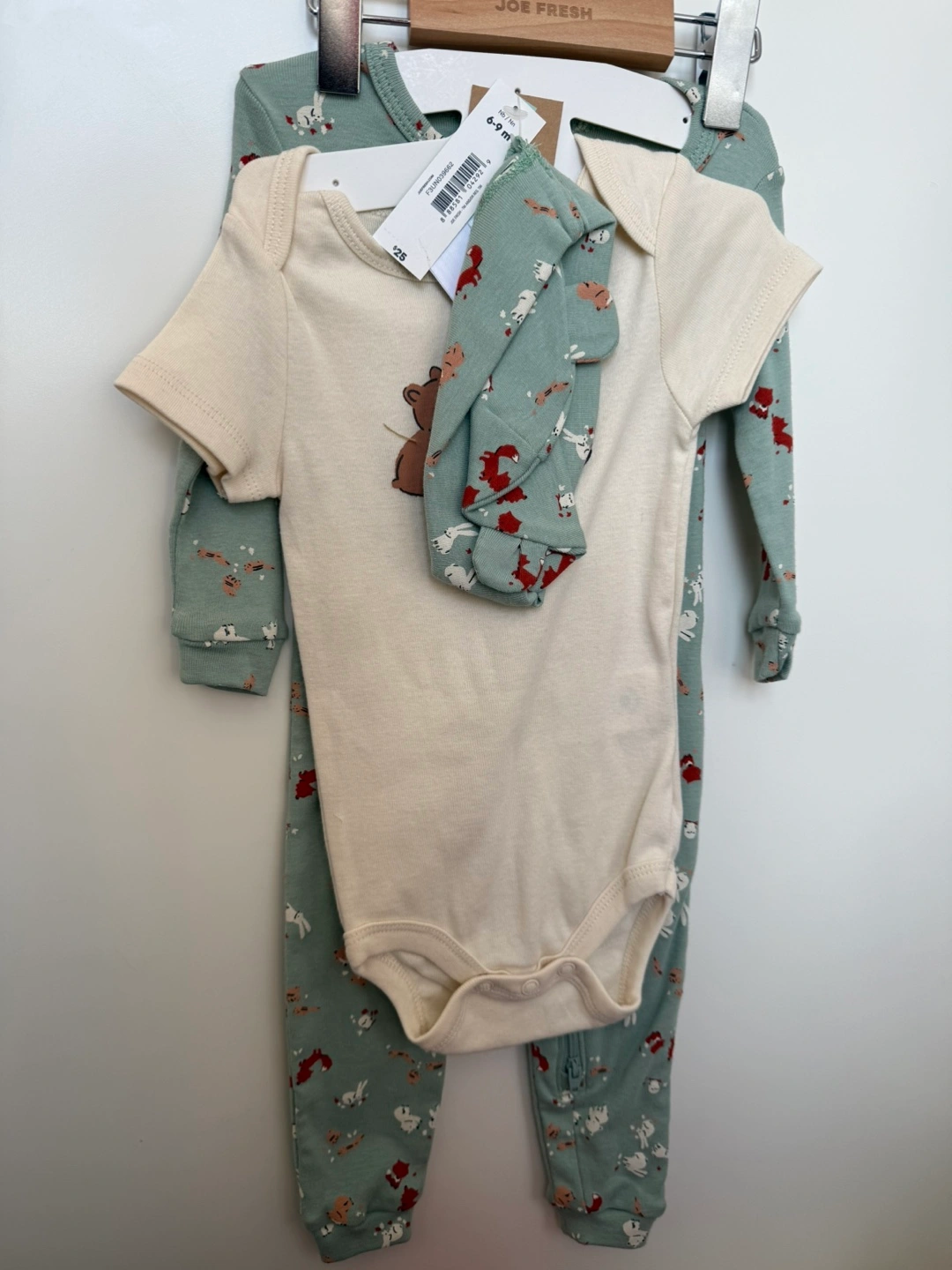 Adorable 3-piece baby outfit. Includes bodysuit, pants, and socks. Features a cute woodland animal print. Organic cotton. Excellent condition.