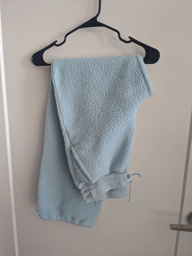 Light blue teddy bear fleece pants. Super comfy and a nice tealy light blue with a drawstring waistband, and drawstring ankles. Great condition