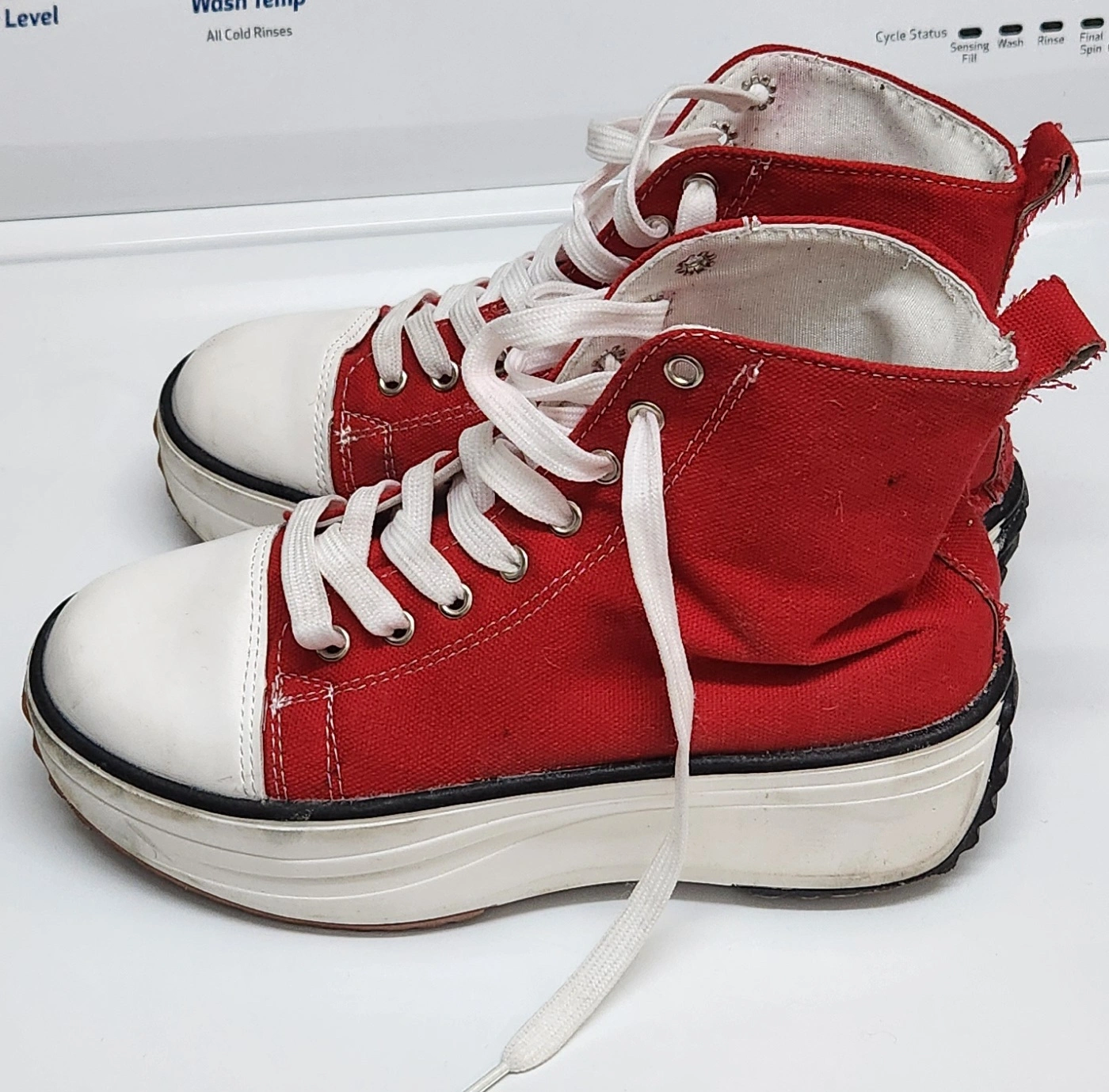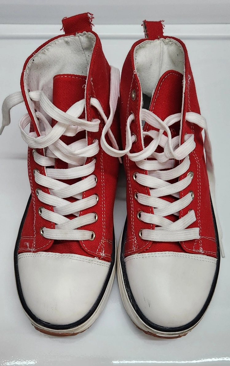 Women's red high-top sneakers. Platform sole. White laces and toe cap. Canvas upper. Pre-owned.