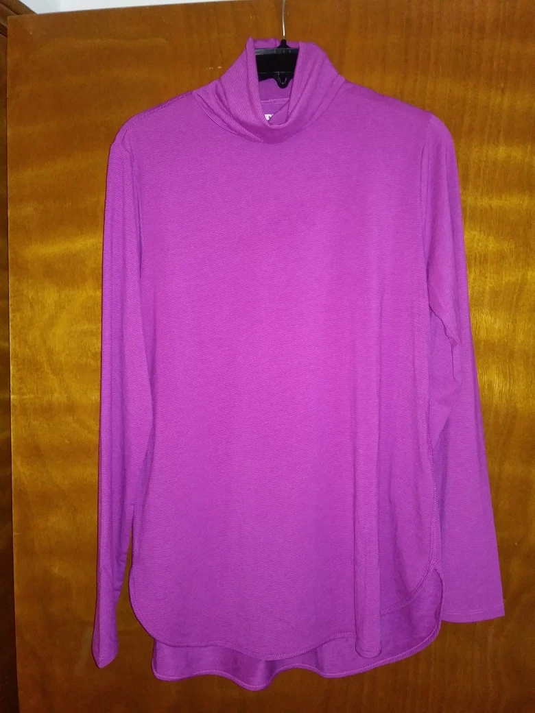 Women's purple mock neck long sleeve top. Size medium. Made in Peru. Long sleeves, relaxed fit. Curved hem. Colour is warmer in natural light
