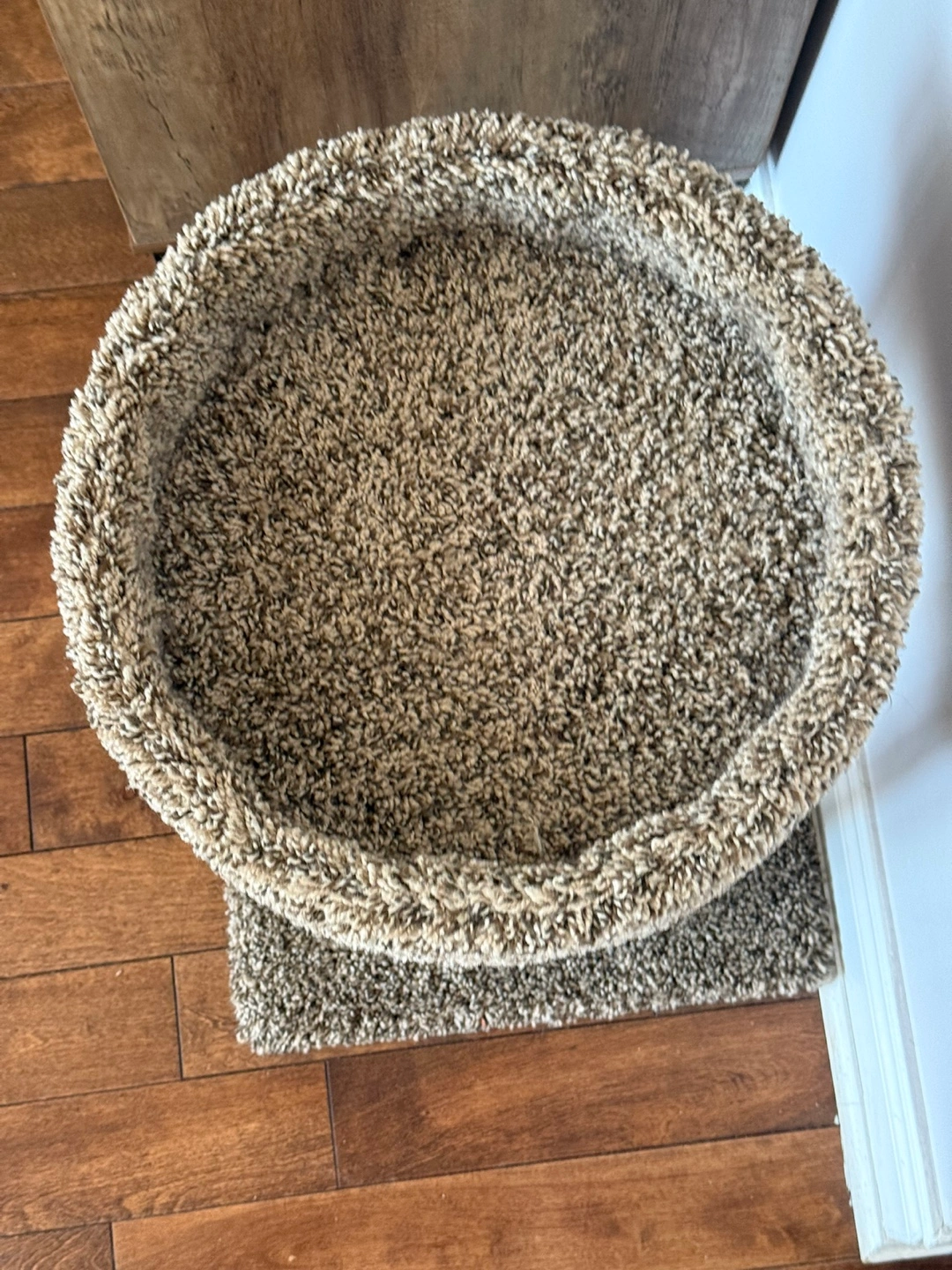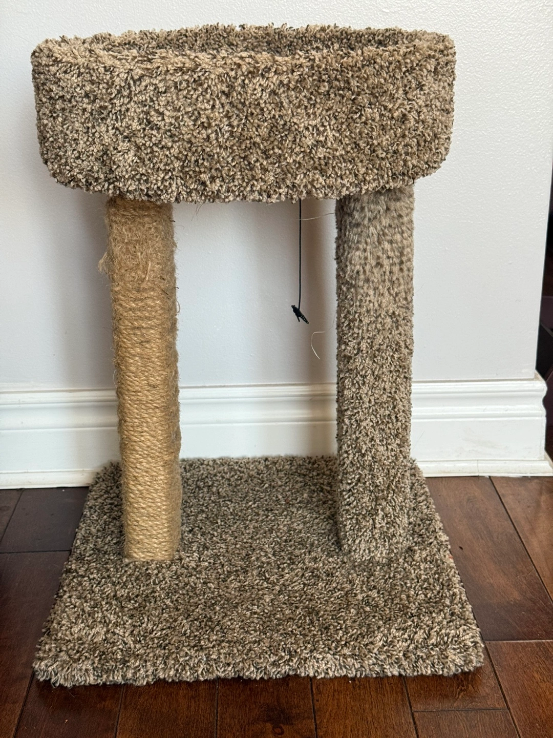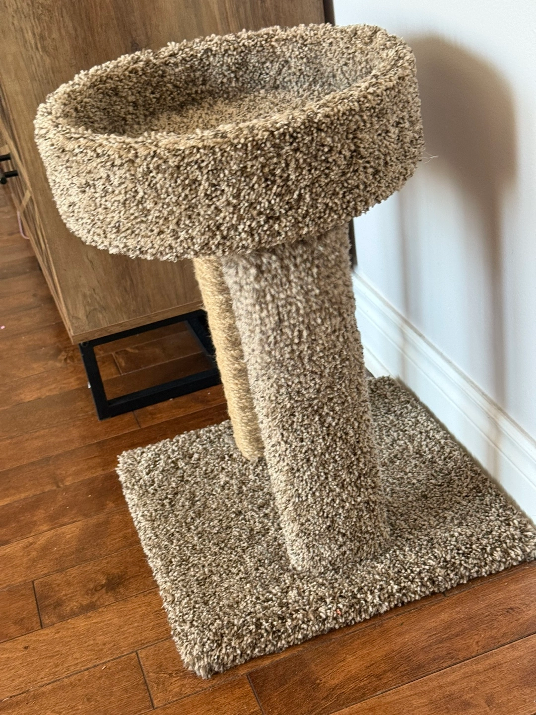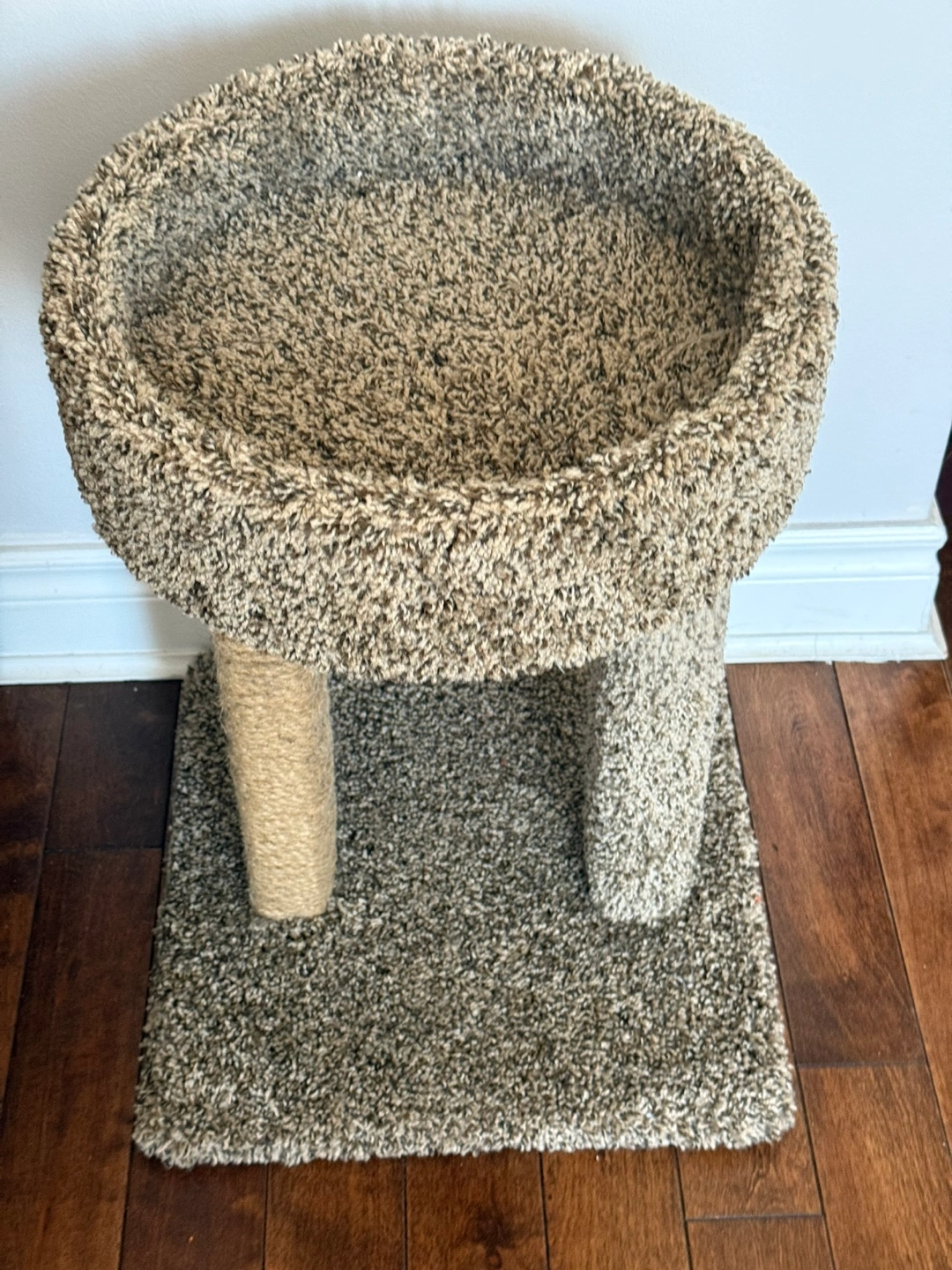Small cat tree. Features a cozy oval-shaped bed and two sisal-wrapped posts. Beige carpet covering. Small base for stability.