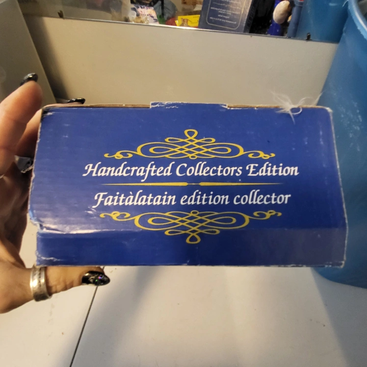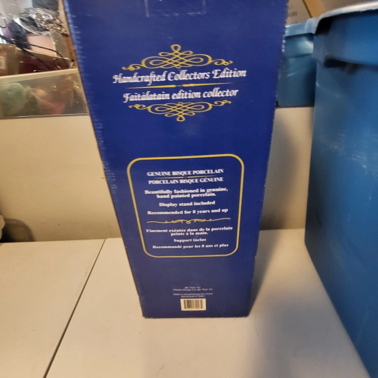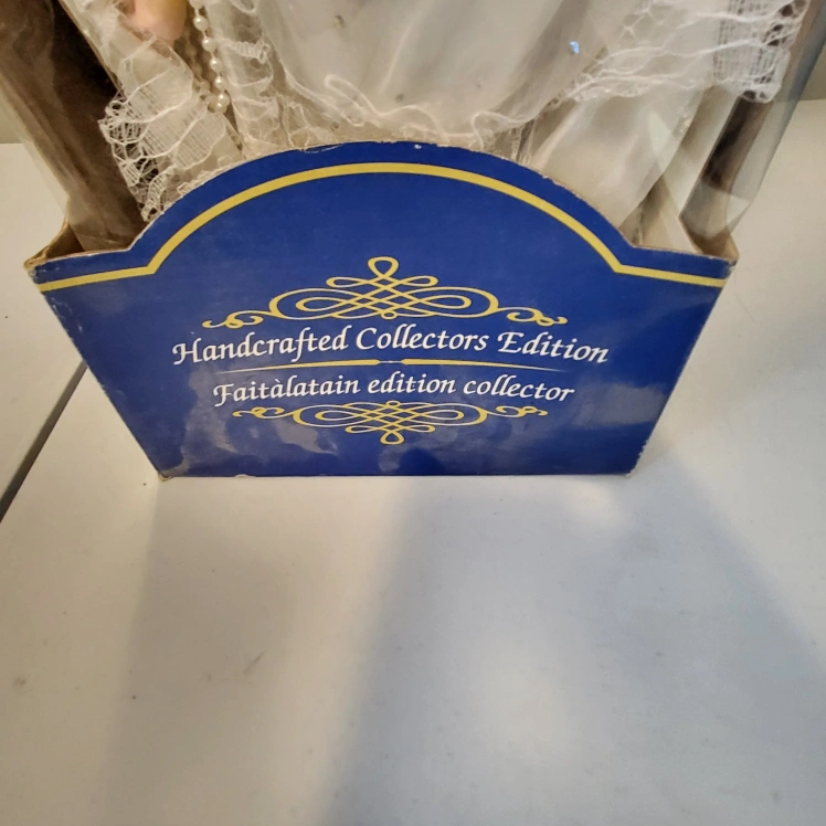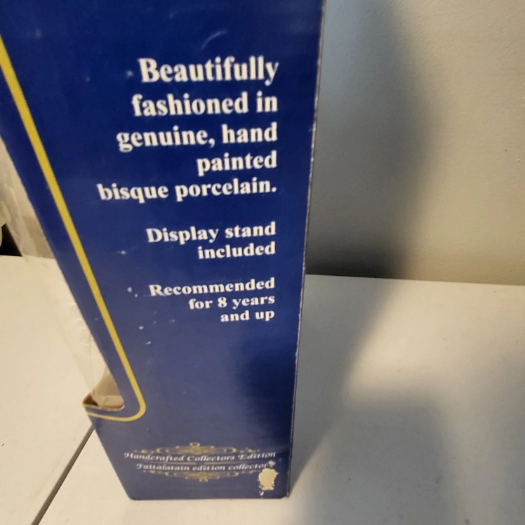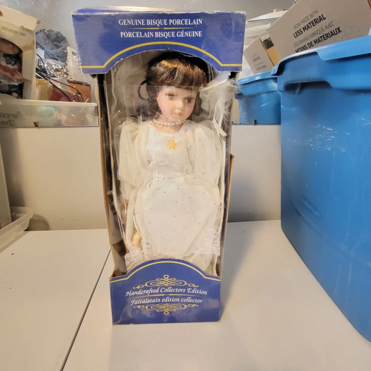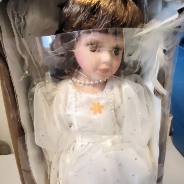 Genuine bisque porcelain doll. Handcrafted collectors edition. Brown hair, white dress. Comes in original box. Display stand included. Smoke free home Rossland and Stevenson north