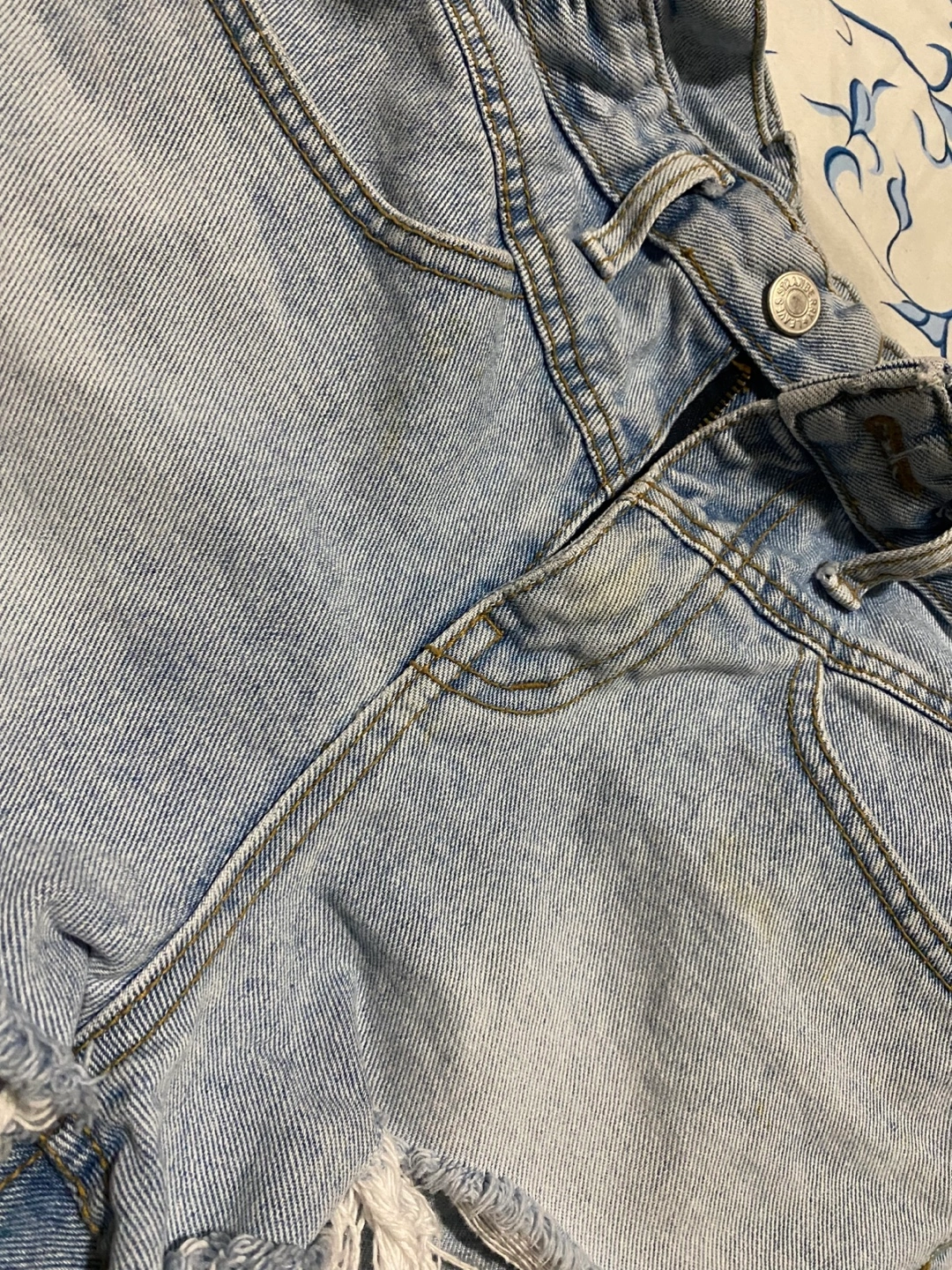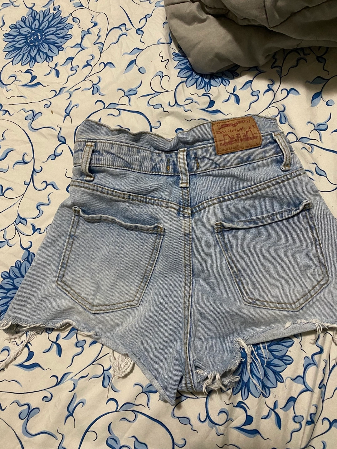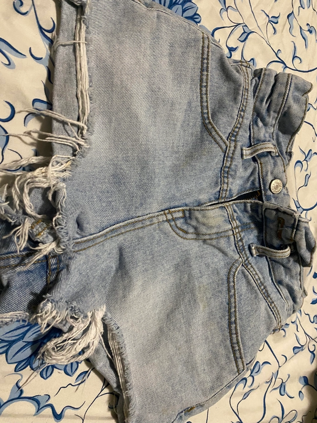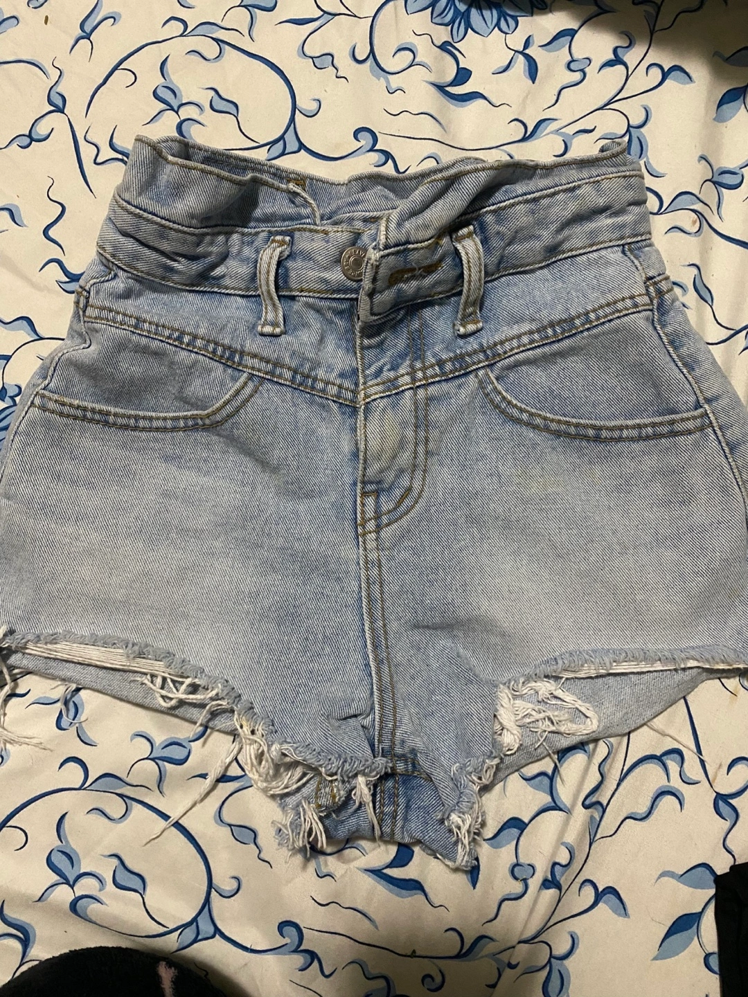 Light wash denim shorts. Distressed hem. Size 26. Made in Korea. 97% cotton, 3% poly.