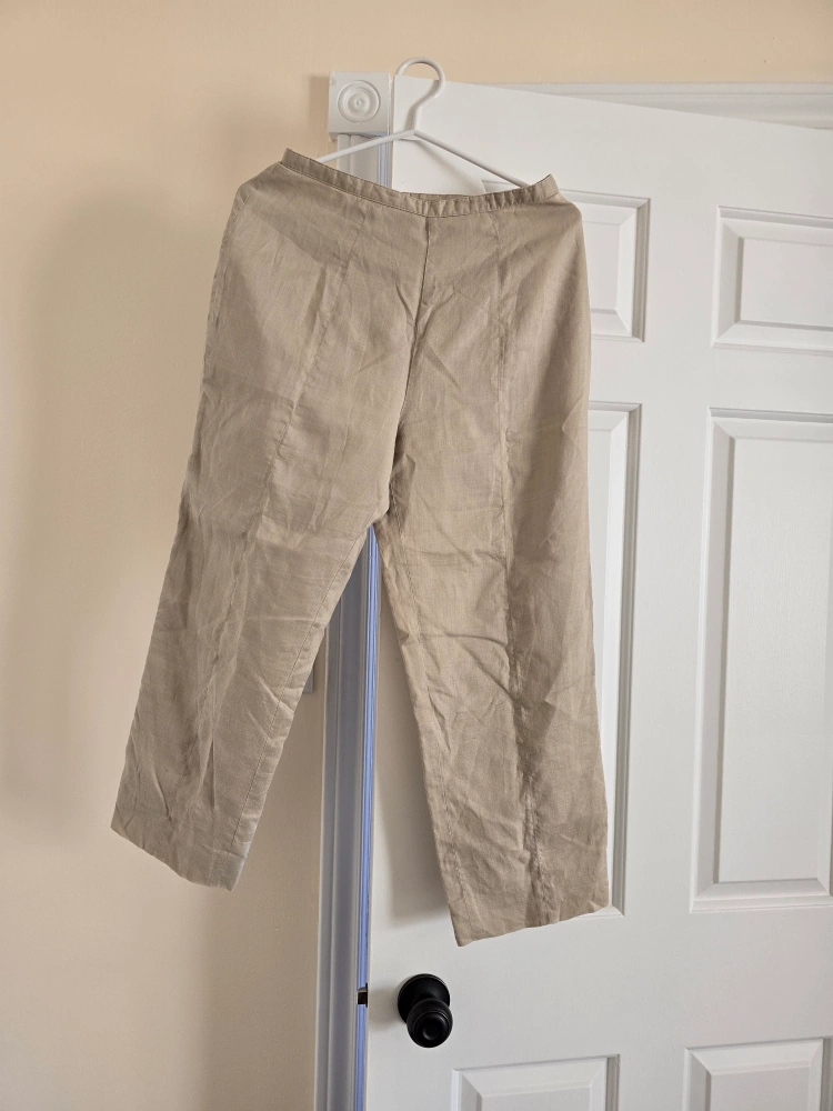 Lightweight, beige pants. Pull-on style. Excellent for warmer weather. Relaxed fit.