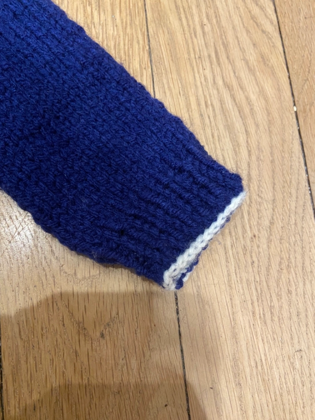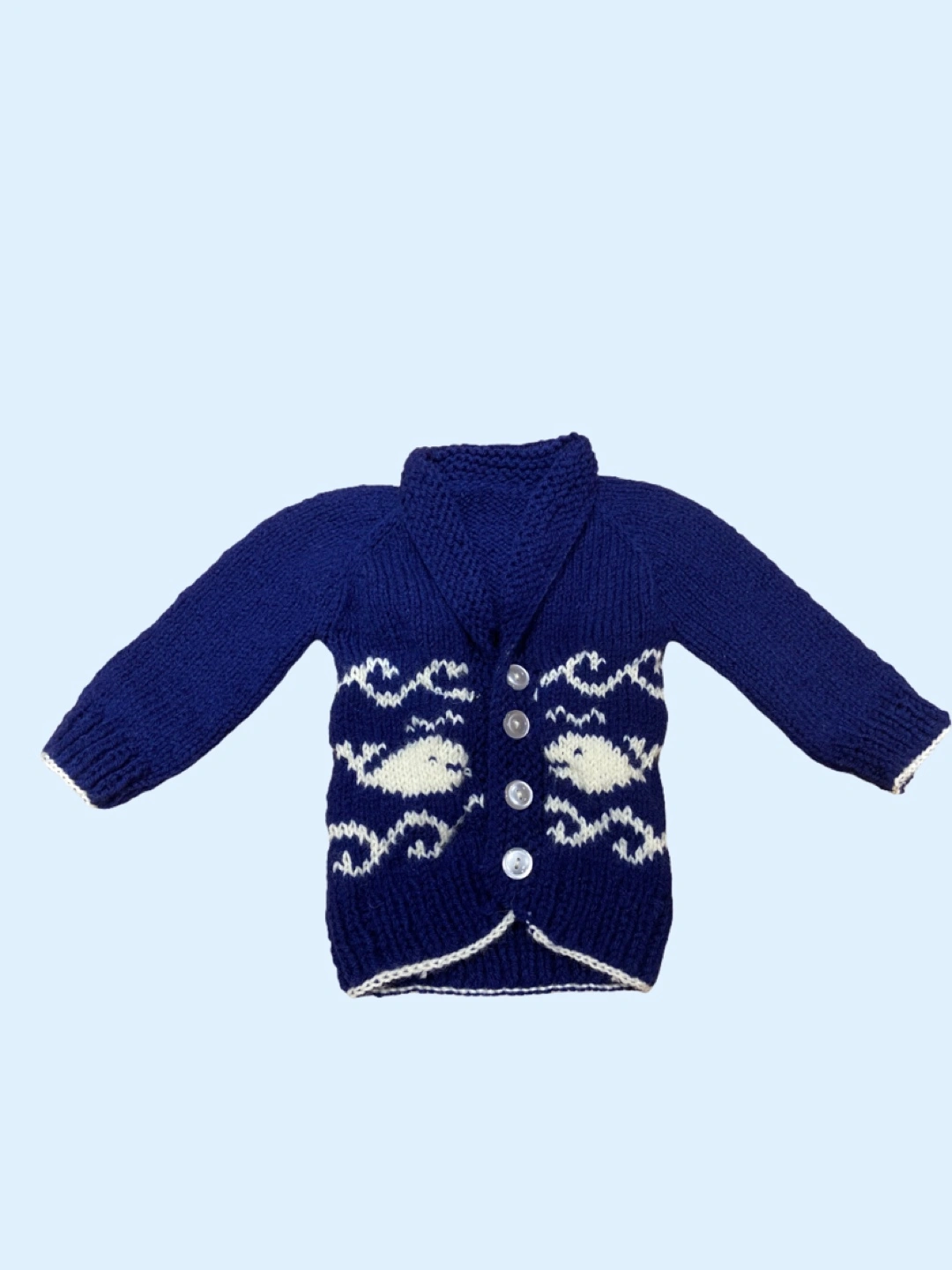 Beautiful blue hand-knitted baby cardigan. Features a charming whale design and button closure. Broadview and Danforth.