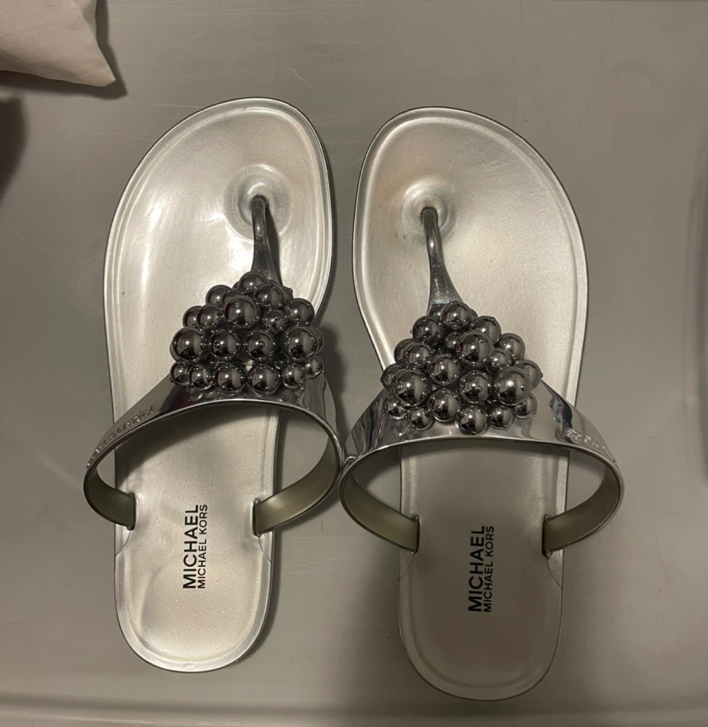 Silver thong sandals. Beaded embellishment adorns the toe. Michael Kors branding visible on the insole.