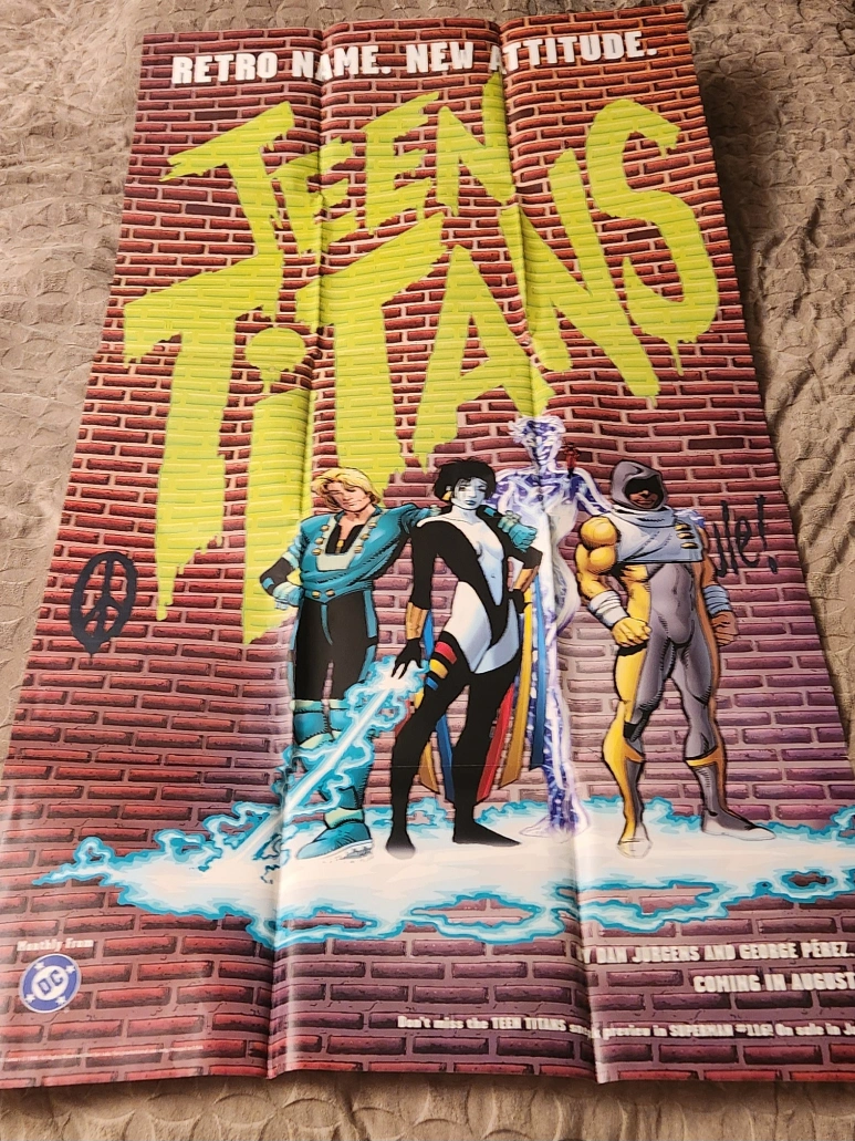 Vintage Teen Titans poster featuring the team against a brick wall backdrop. Includes art by Dan Jurgens and George Pérez. DC Comics branding visible.
