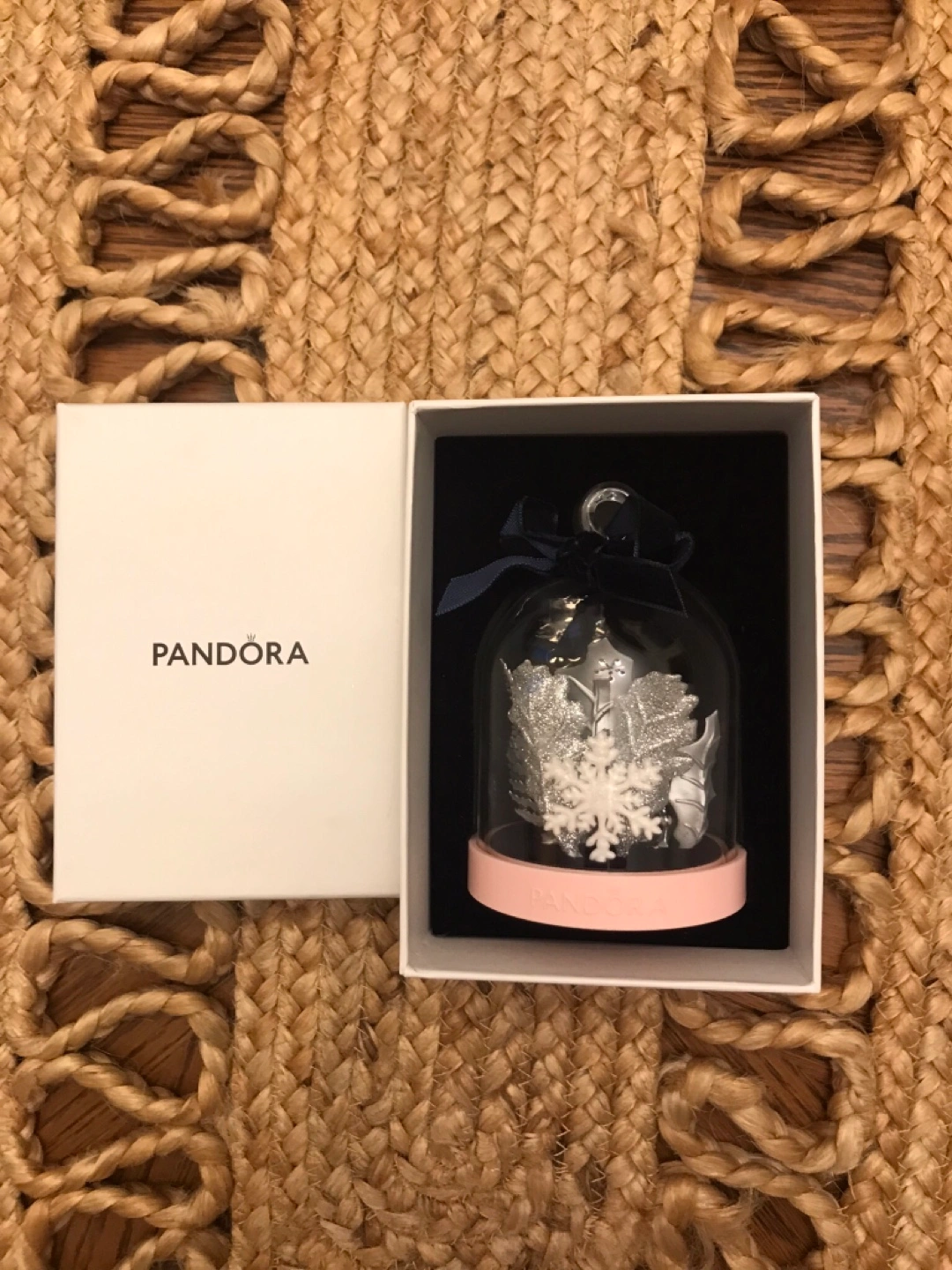Glass dome ornament. Features silver and white accents. Includes a small gift box and snowflake charm. Comes in original Pandora box. Dated 2019.