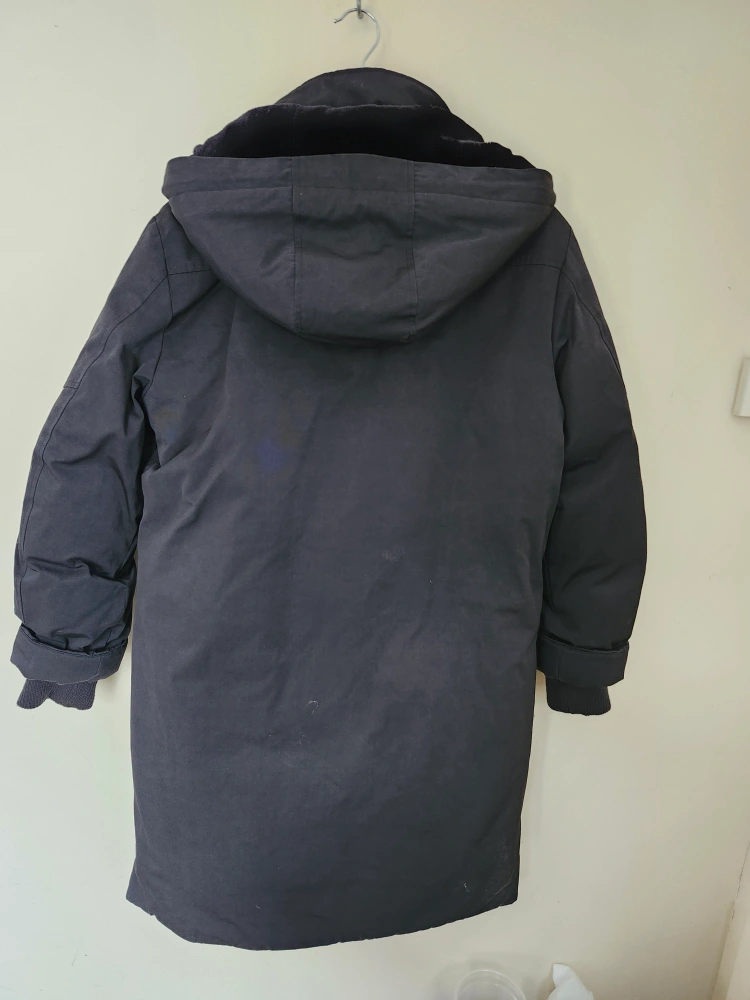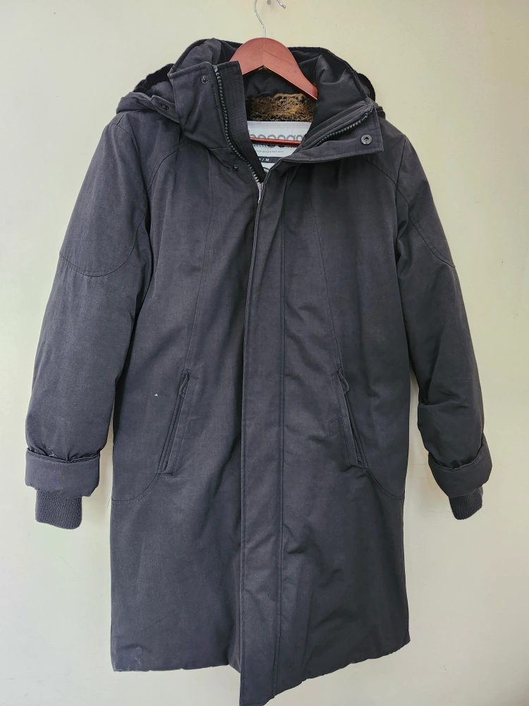 Looking for something super warm, comfy and Canadian made? Women's long black parka, knee-length. Size medium. Features a faux fur lined hood and shoulders, and ribbed cuffs. Multiple pockets. Excellent like-new condition.