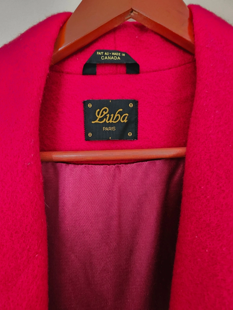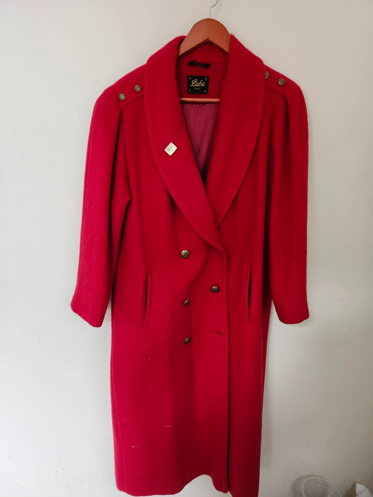 Gorgeous vintage red pure wool full-length coat. Double-breasted, collared, and features brass buttons. Silk lining, no rips. Missing one button but otherwise in excellent condition. Very flattering! Made in Canada.