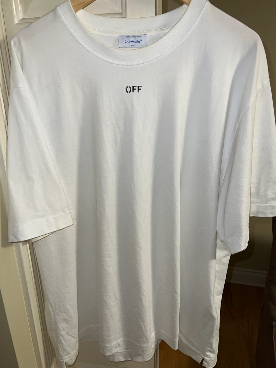 Men's oversized white cotton t-shirt. Features small black OFF logo on chest. Simple design, great for everyday wear. New with tags. Enjoy and let me know please