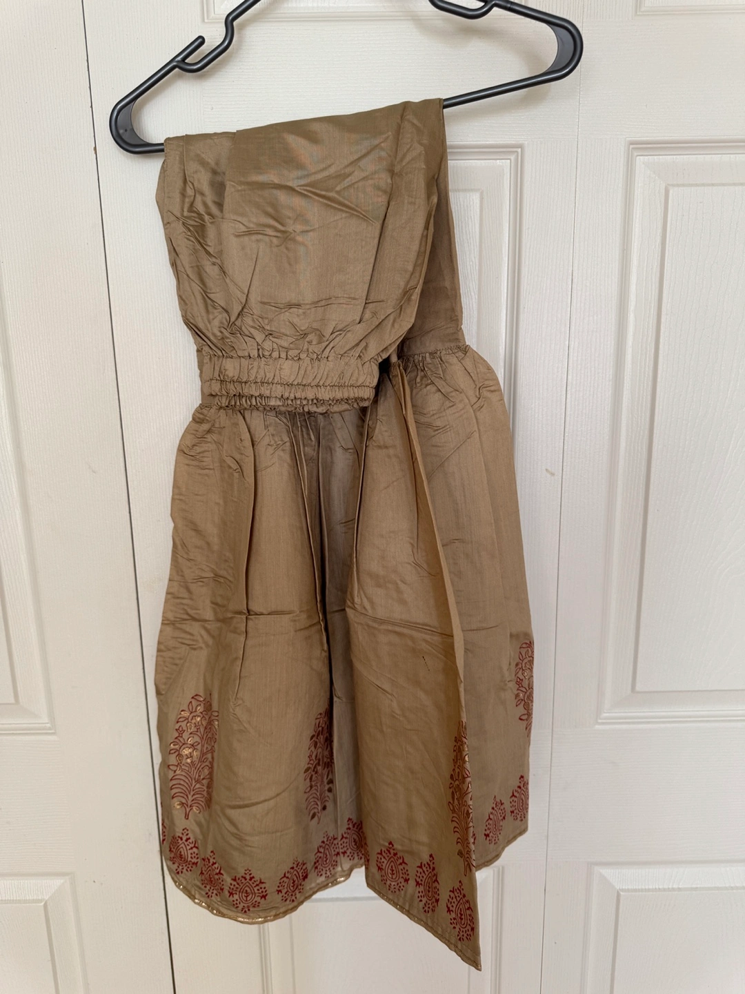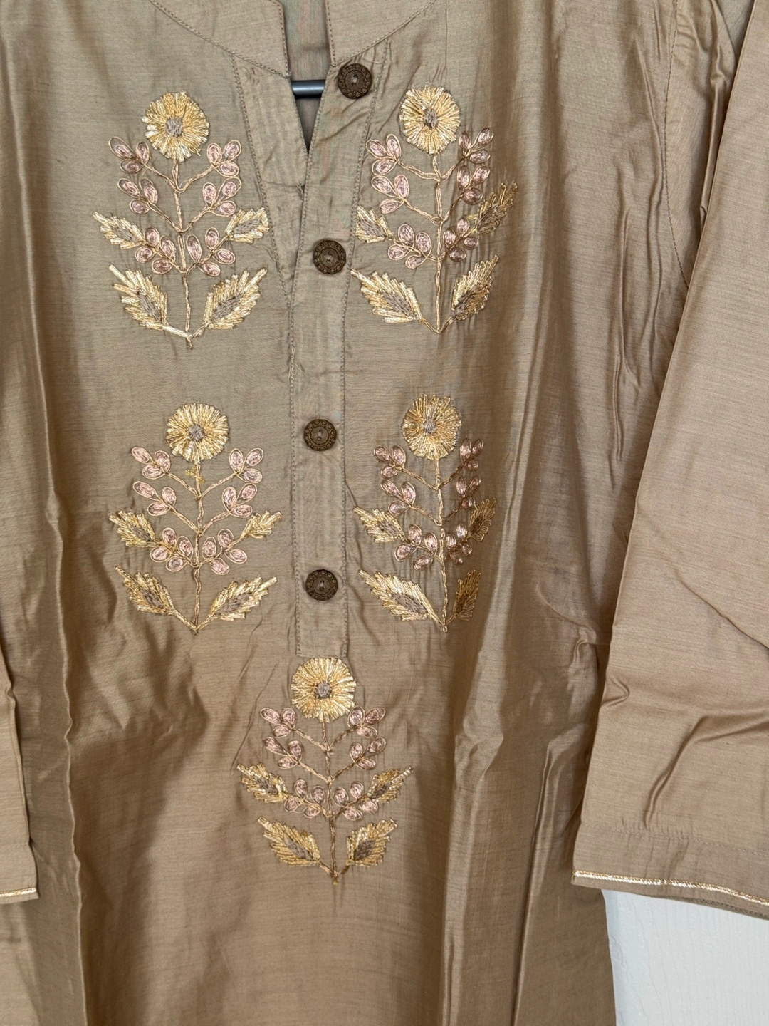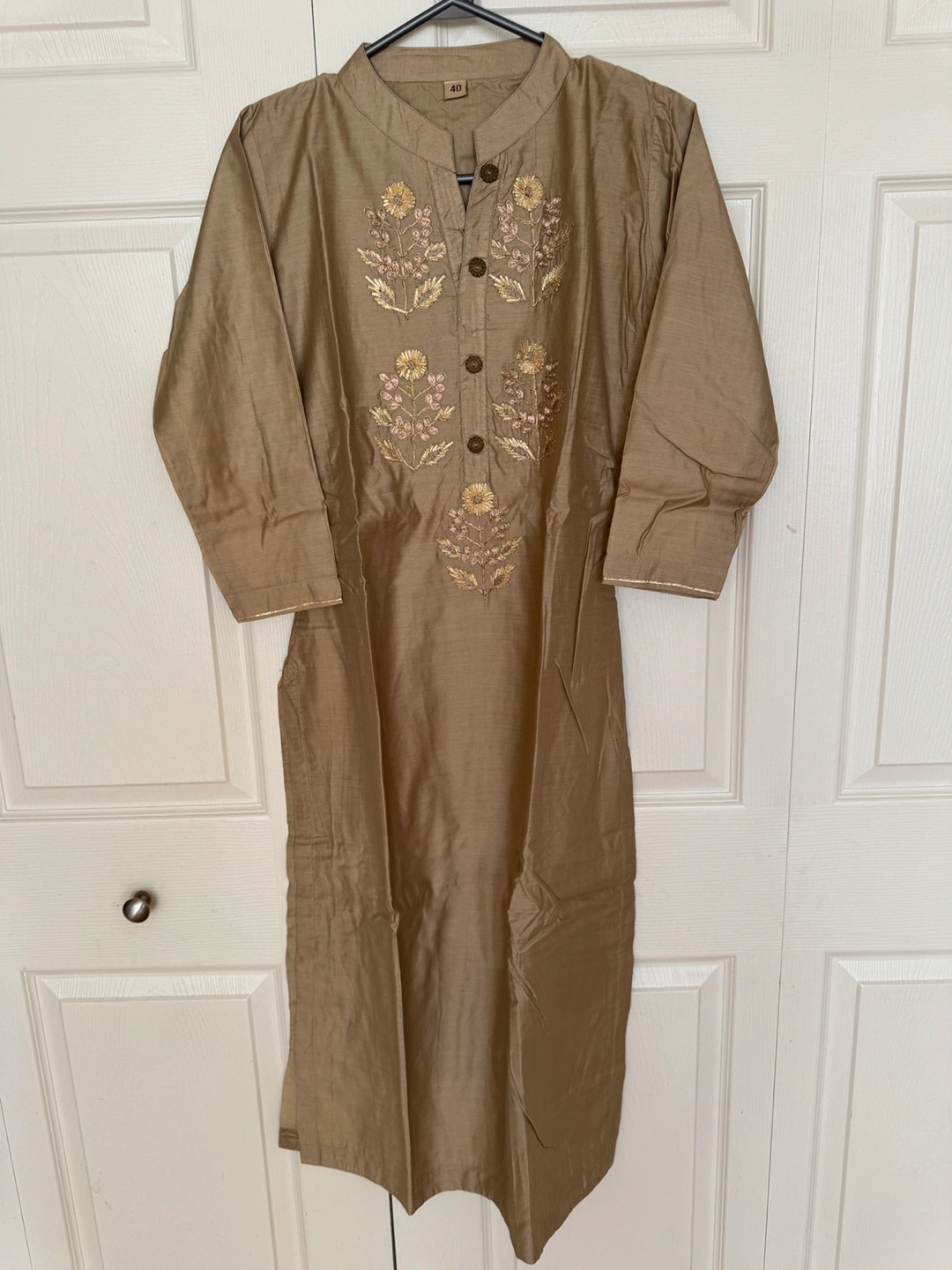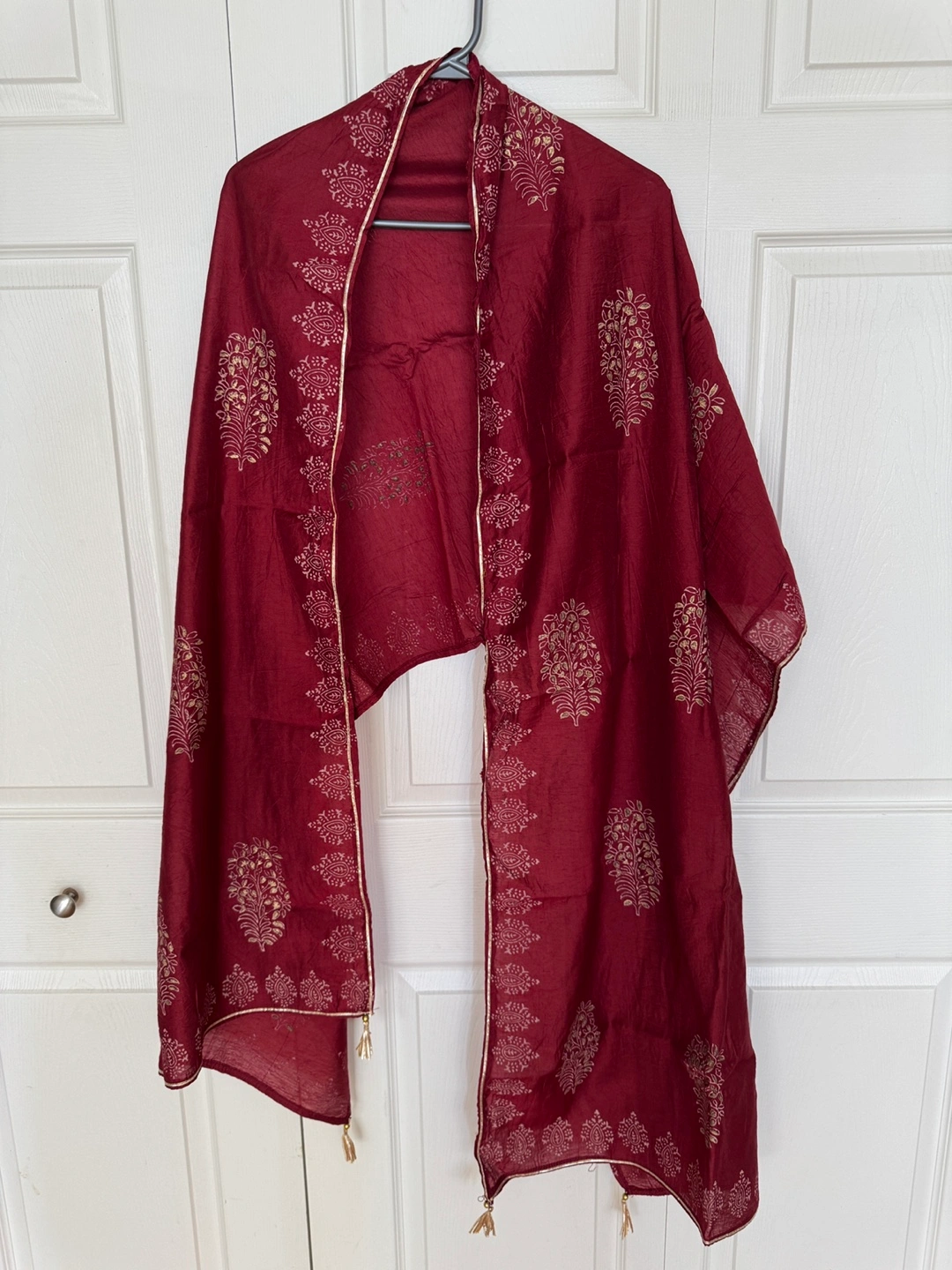Beautiful three-piece set. Kurti features embroidered floral accents. Palazzo pants have a comfortable elastic waistband. Dupatta is a rich maroon colour. Size 40.pickup near dixie and bloor