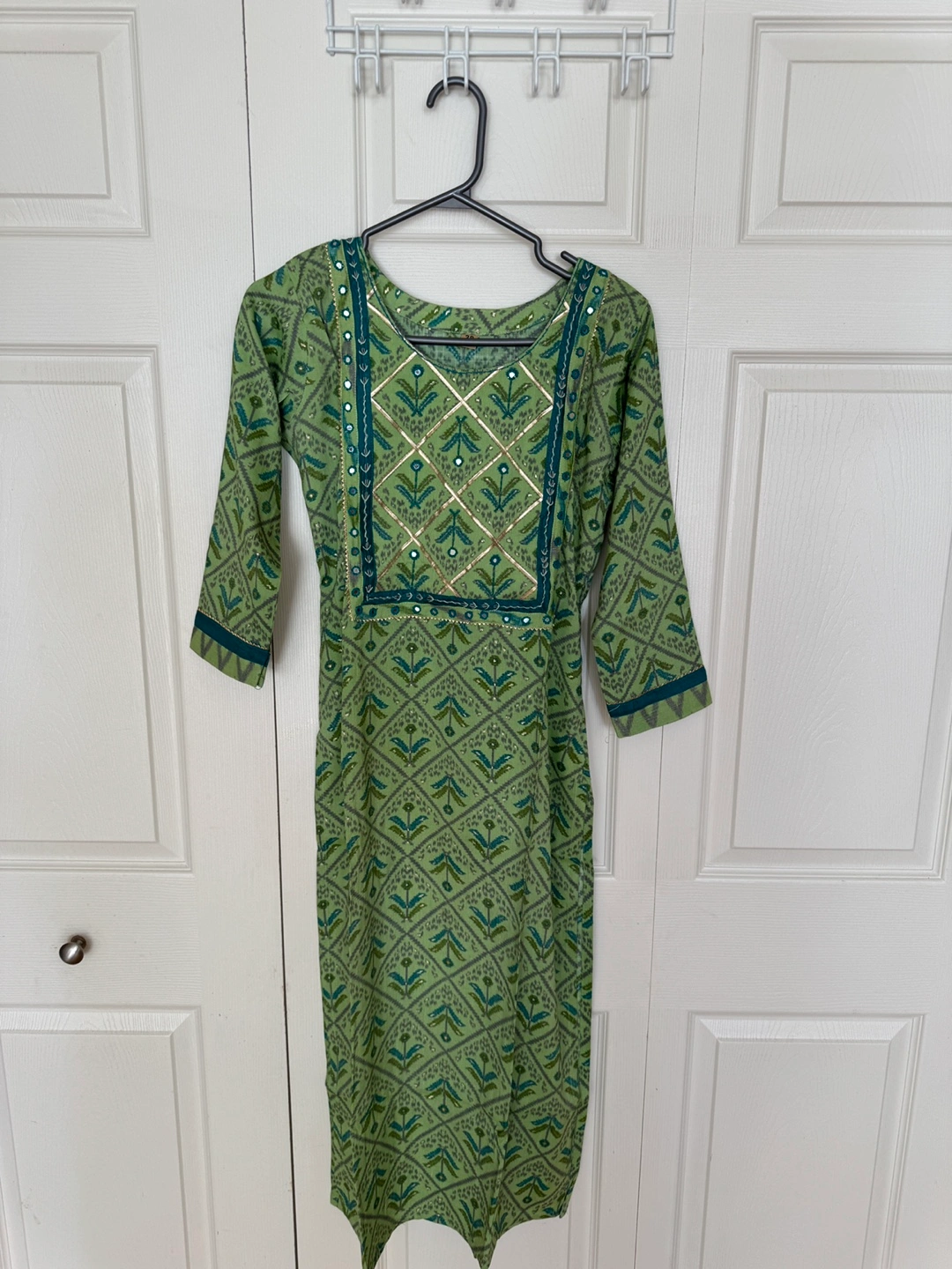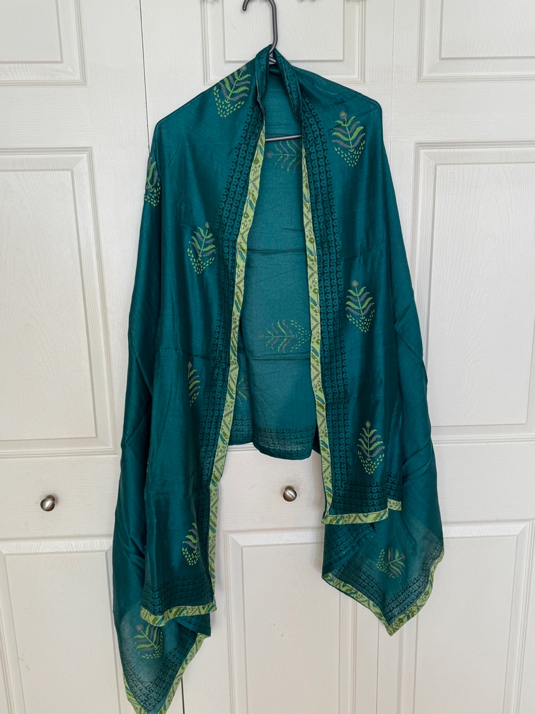 Gorgeous three-piece salwar kameez set. Features a green kurta with intricate embroidery, matching palazzo pants, and a teal dupatta. Perfect for any occasion.puckup near dixie and bloor