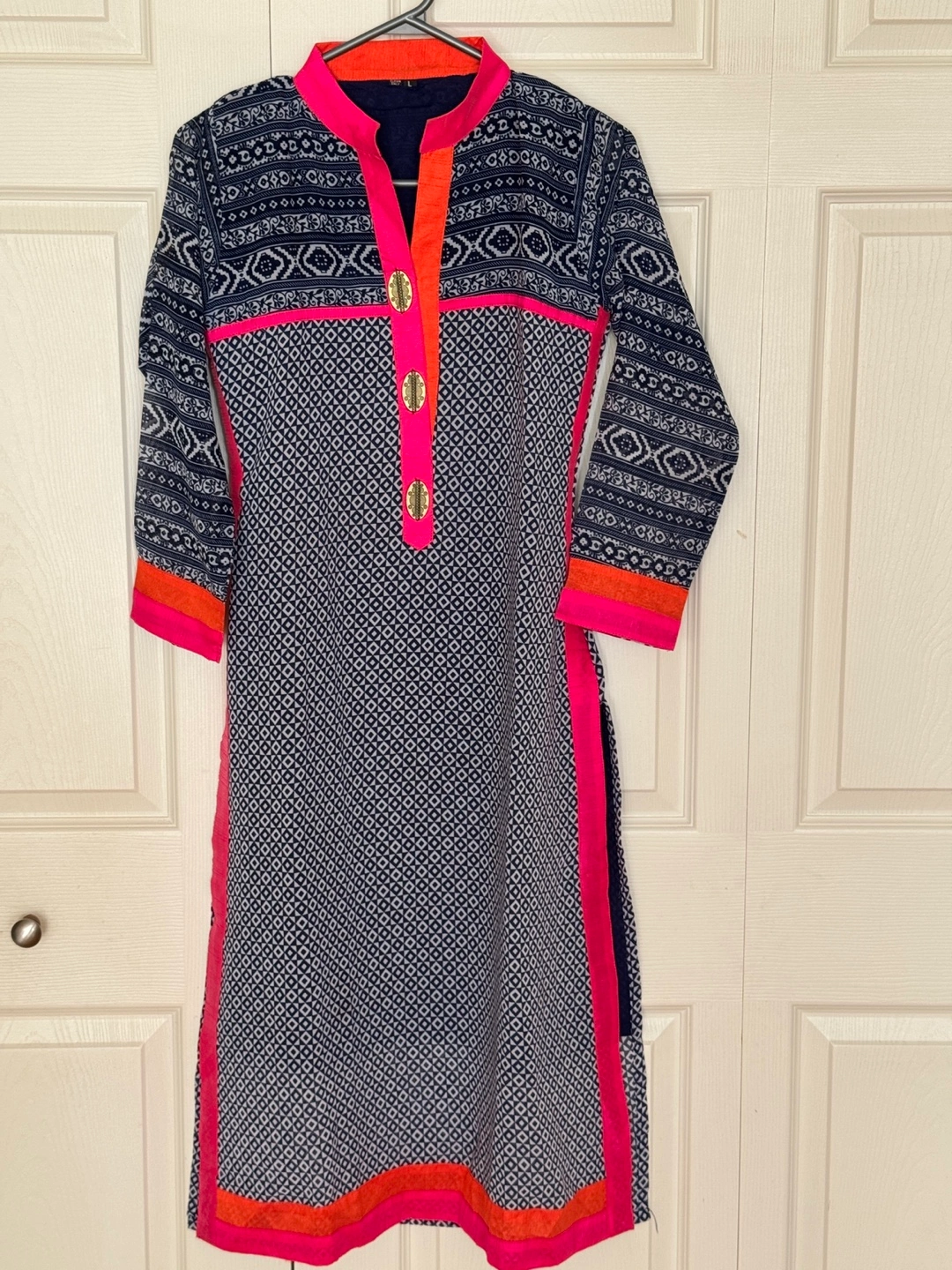 Beautiful navy blue and white geometric print kurti. Features three-quarter sleeves, a mandarin collar, and pink and orange trim. Button closure. Great for any occasion.pickup near dixie and bloor