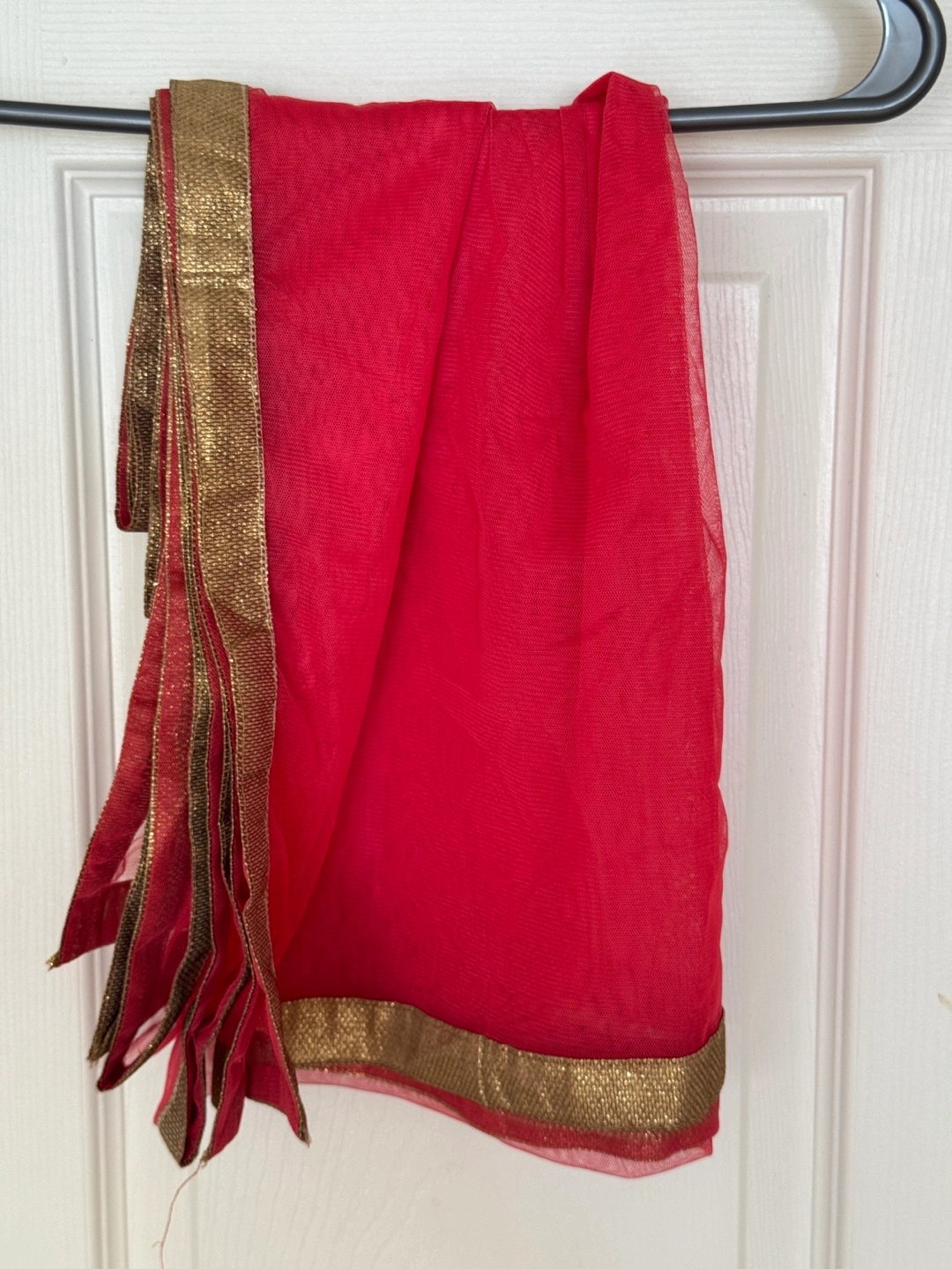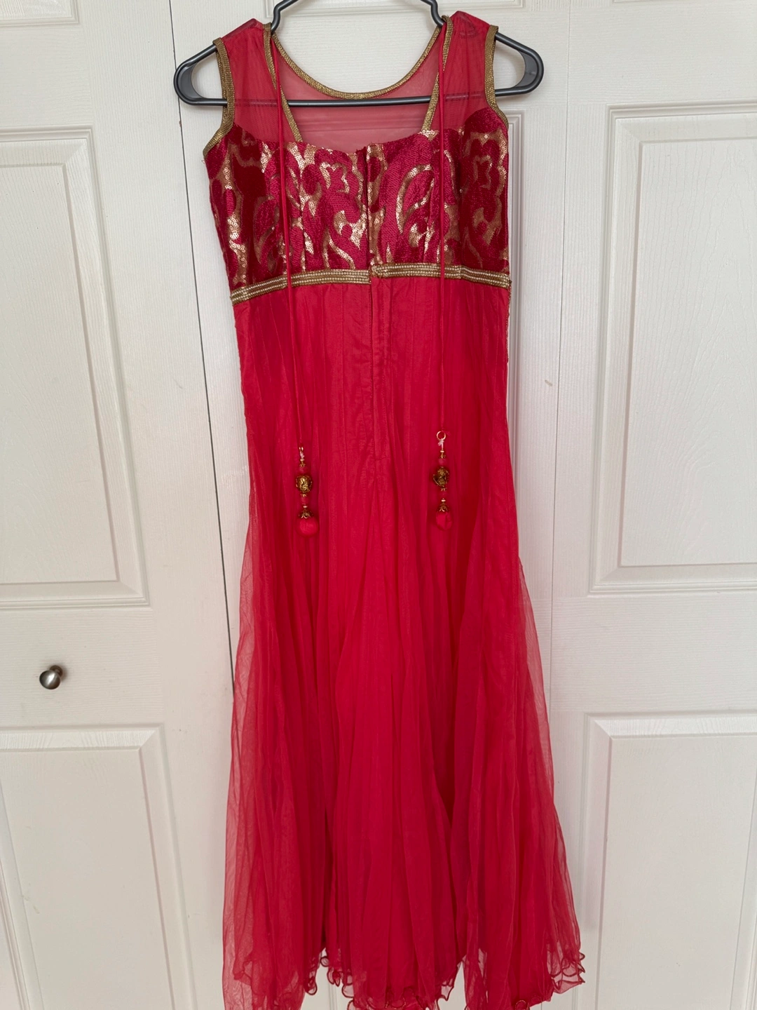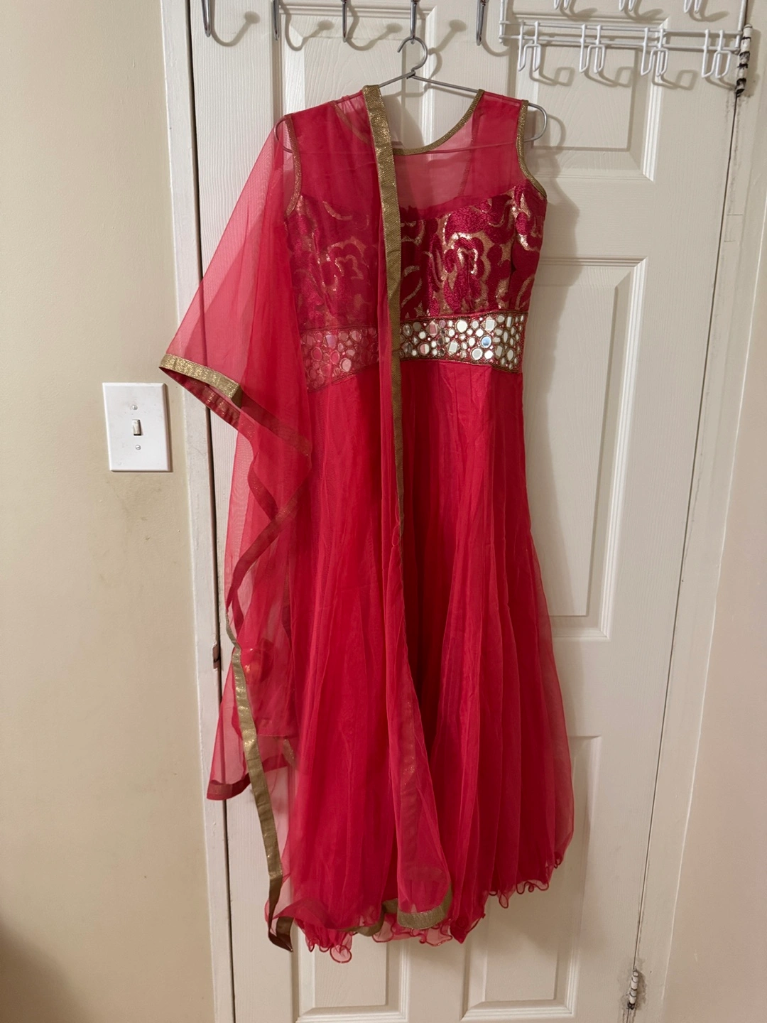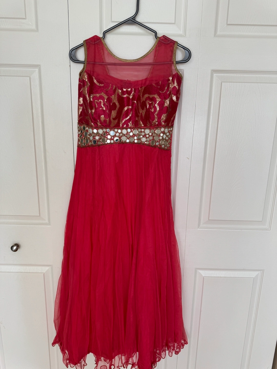 Beautiful red salwar kameez. Features gold embroidery and mirror work. Includes a matching dupatta. Sleeveless kameez. Long, flowing design. Perfect for special occasions.worn once only.pickup near dixie and bloor