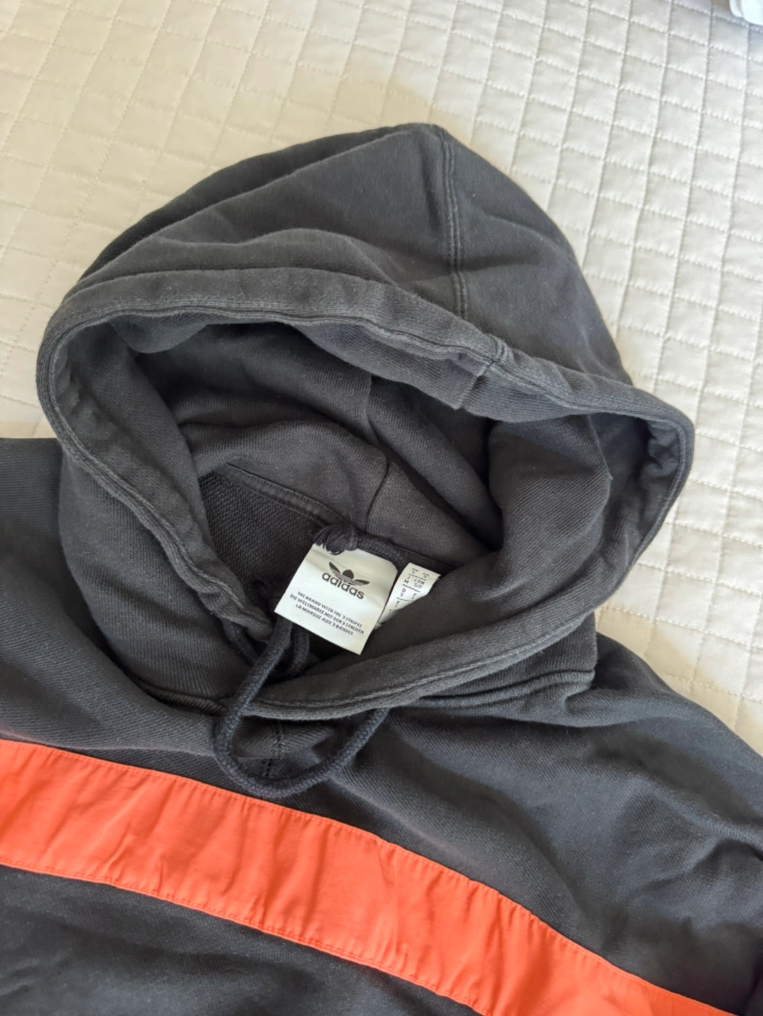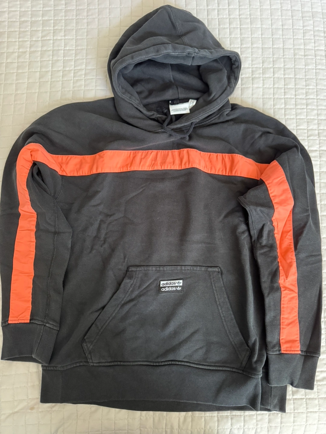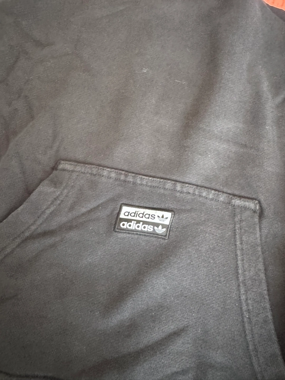 Black Adidas hoodie. Features orange stripes on sleeves and across the chest. Adidas branding visible on the pocket and back. Pick up in Woodbridge