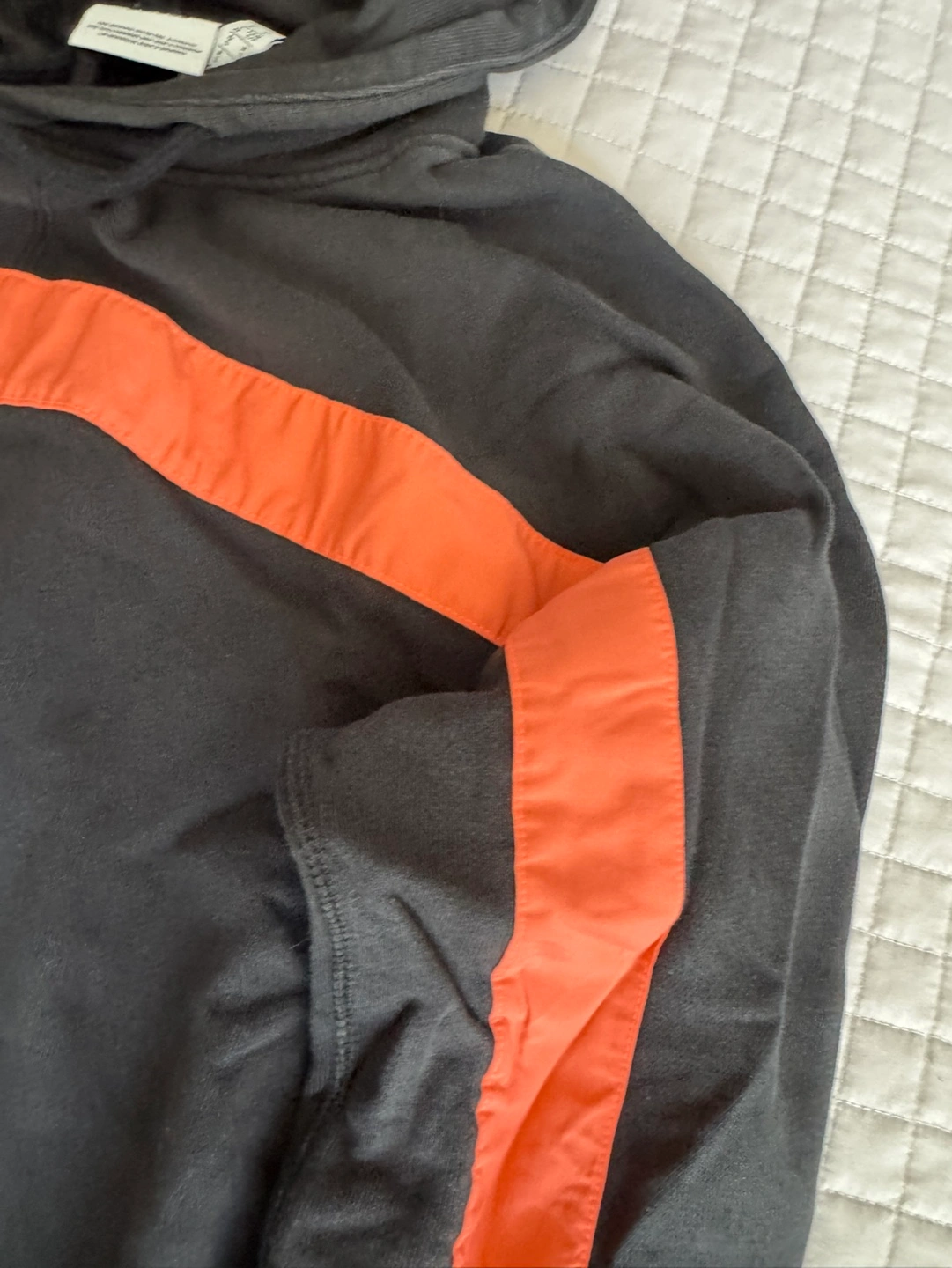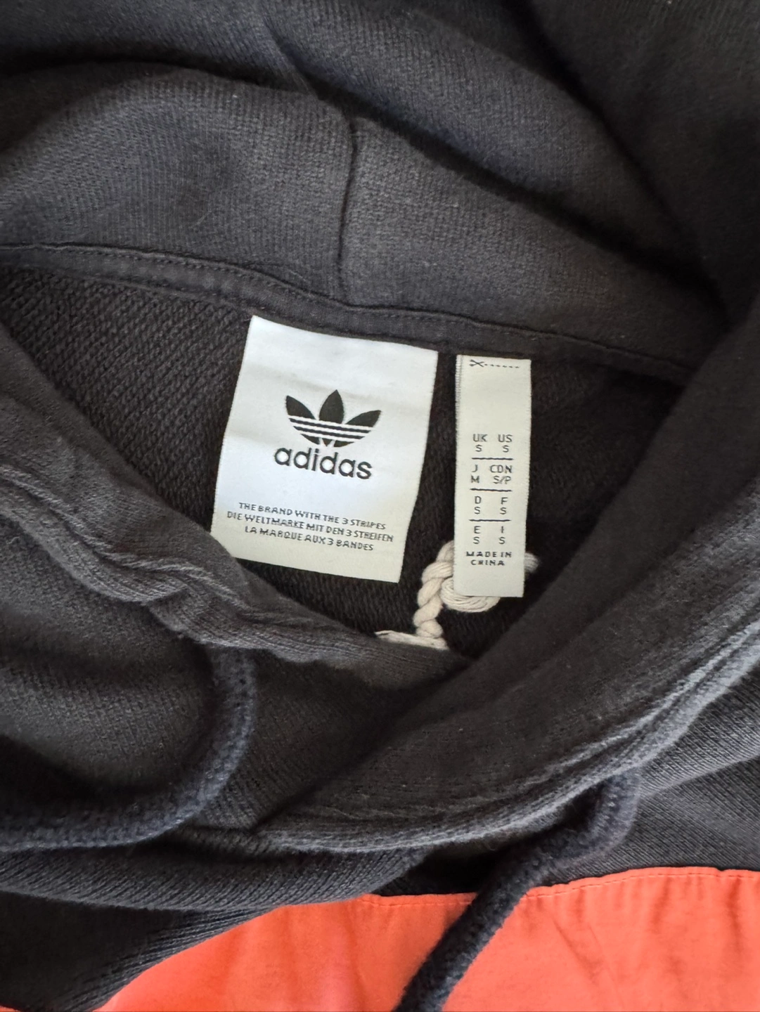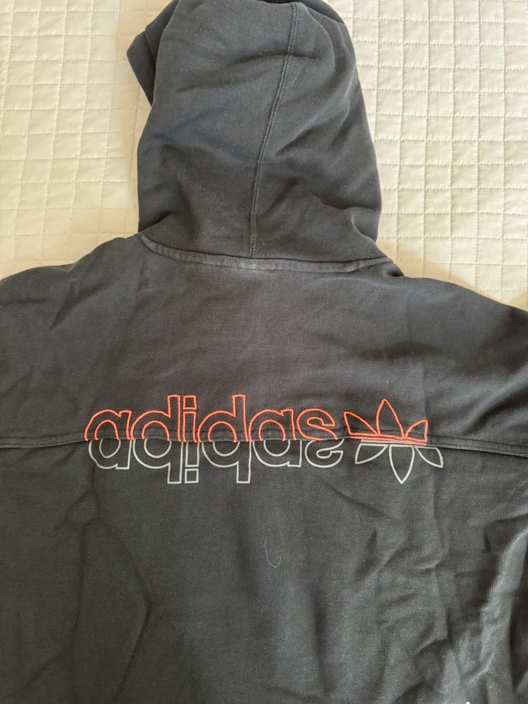 Black Adidas hoodie. Features orange stripes on sleeves and across the chest. Adidas branding visible on the pocket and back. Pick up in Woodbridge