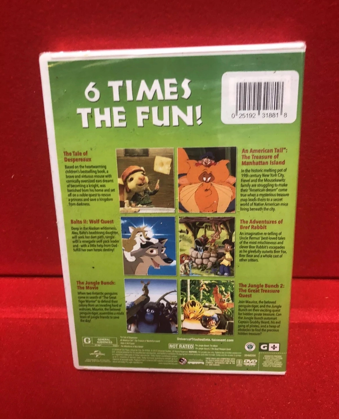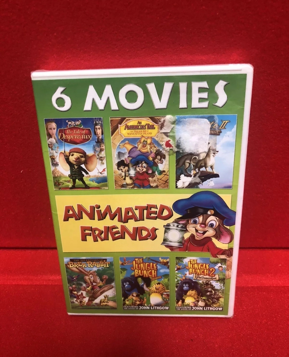 New 6-Movie Animated Friends DVD Collection Six animated movies on one DVD. Includes The Tale of Despereaux, The Pebble and the Penguin, An American Tail: Fievel Goes West, Balto II: Wolf Quest, The Jungle Bunch, and The Jungle Bunch 2: The Great Treasure. Family-friendly animated adventure. $5 Pick up Victoria Park and O’Connor area