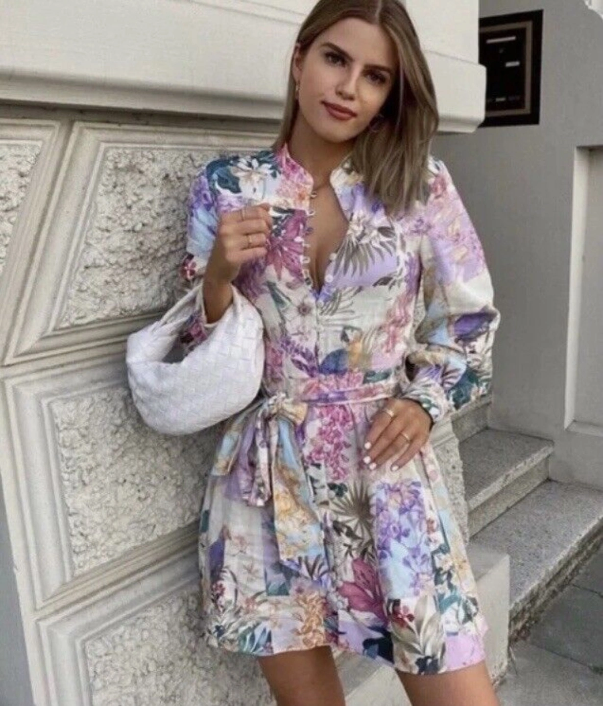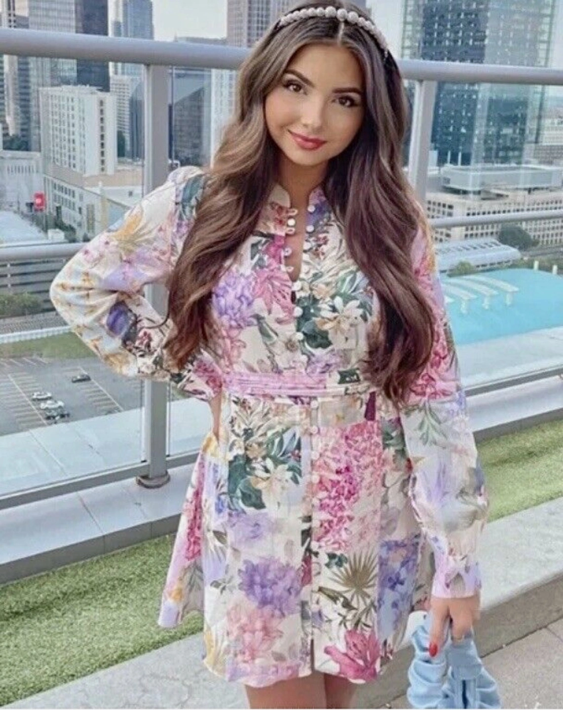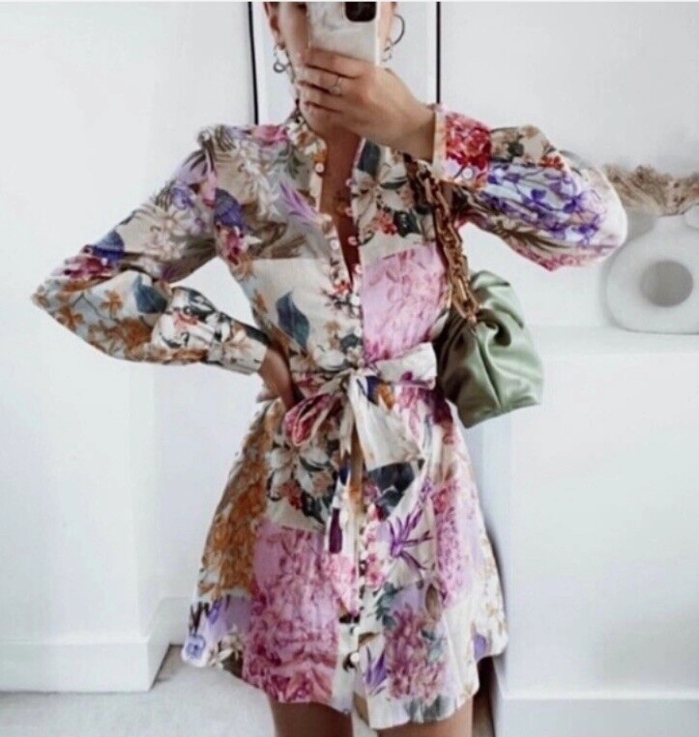 Beautiful floral mini dress. Features long sleeves, button-down front, and a matching belt. Perfect for spring and summer. XS