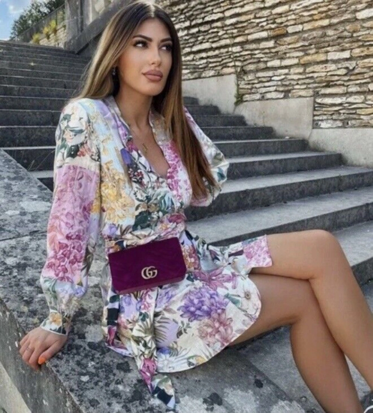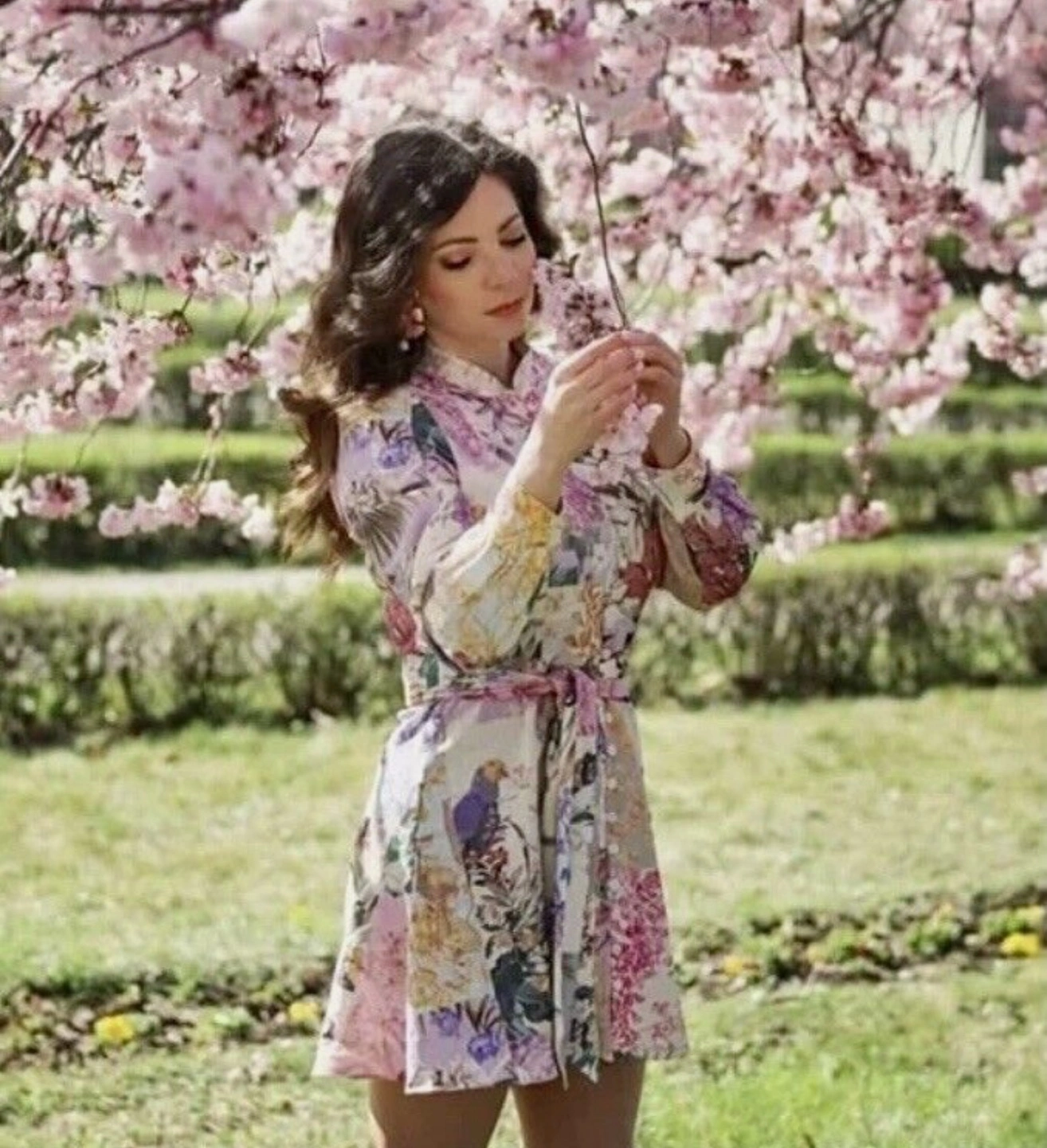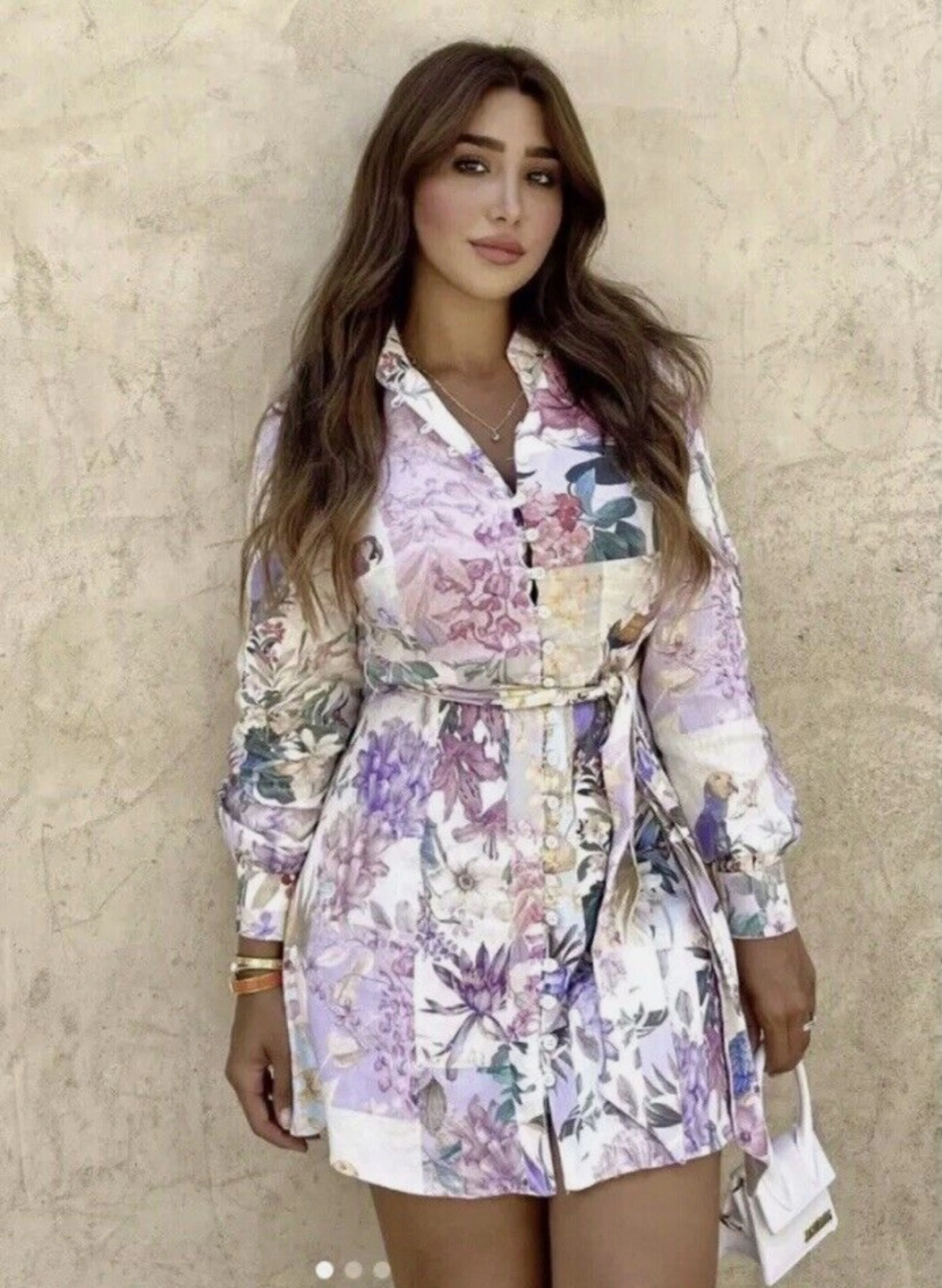 Beautiful floral mini dress. Features long sleeves, button-down front, and a matching belt. Perfect for spring and summer. XS