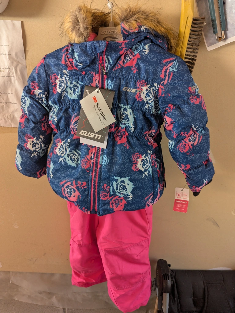Adorable girls' snowsuit. Features a navy blue floral print jacket with a pink faux fur trimmed hood and matching hot pink snow pants. Water resistant and includes grow cuffs. New condition.