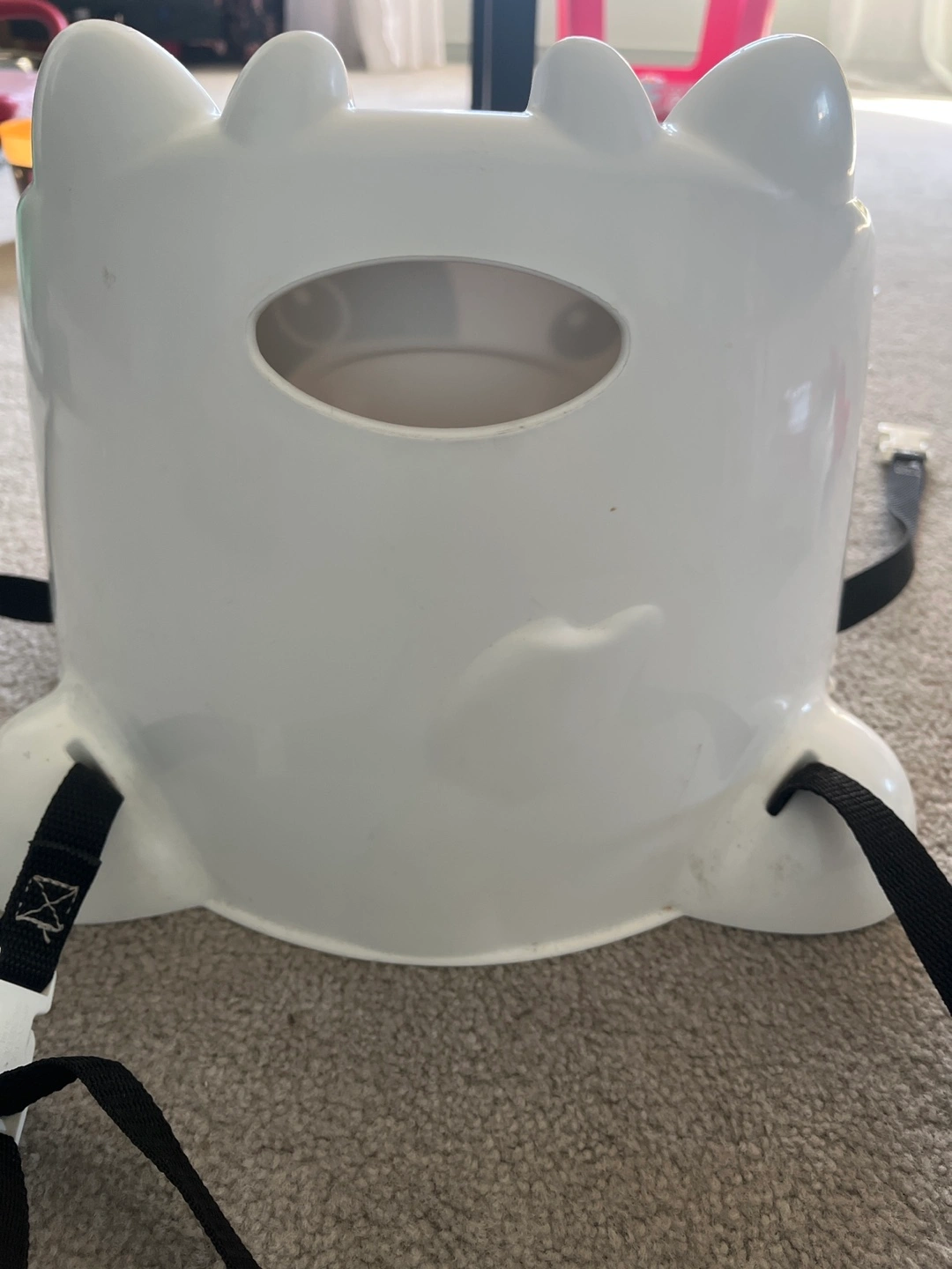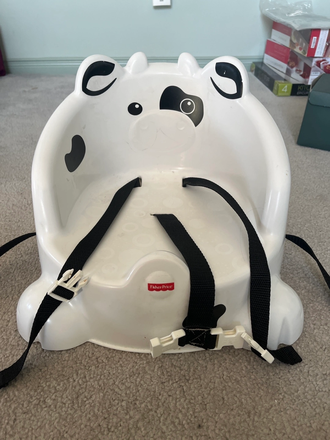 Adorable cow-themed booster seat. Features adjustable straps for safety. Great for toddlers. Plastic construction. Used good Pick up at Creditview and Bristol road west. At 1525 river run plaza outside Pizza Hut. Final sale