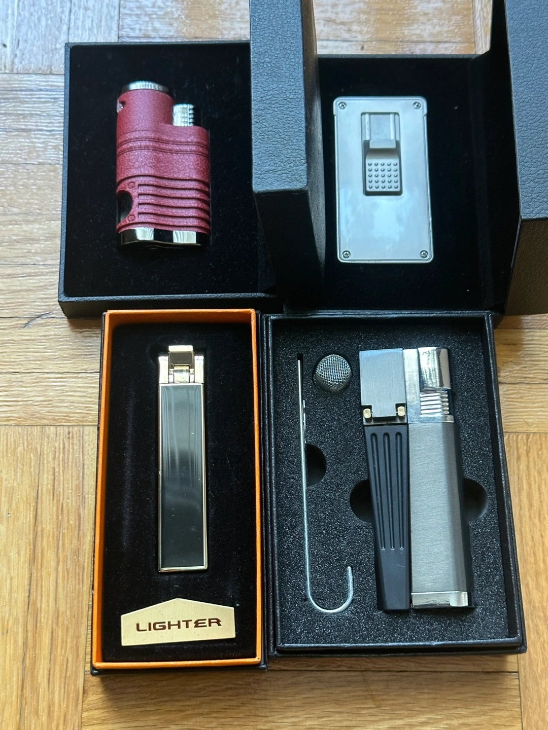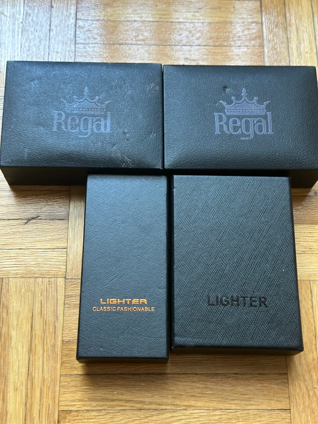 Collection of four lighters. Two in Regal boxes, one classic fashionable lighter, and a unique, multi-piece lighter. All in their original packaging. Ideal for collectors or cigar enthusiasts.