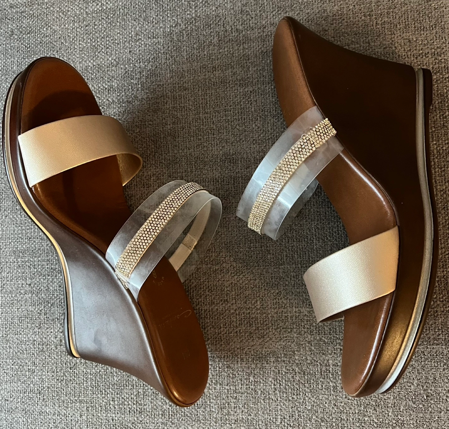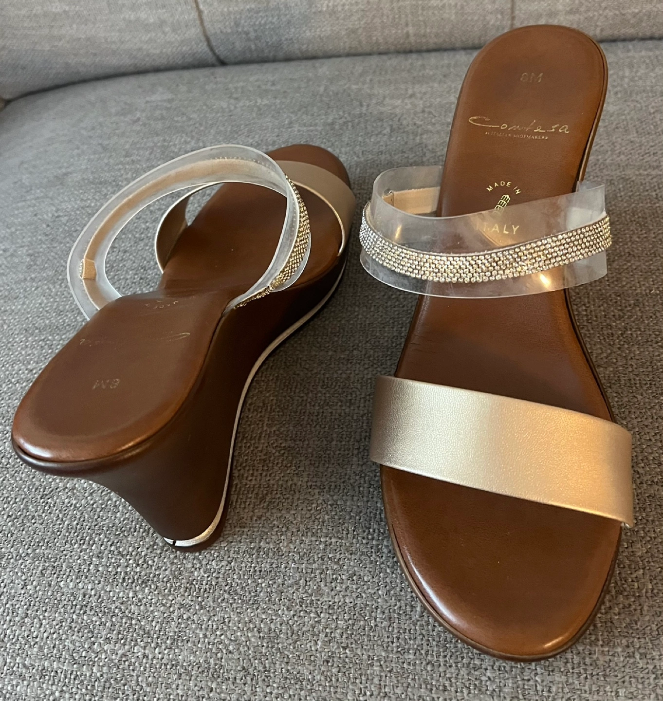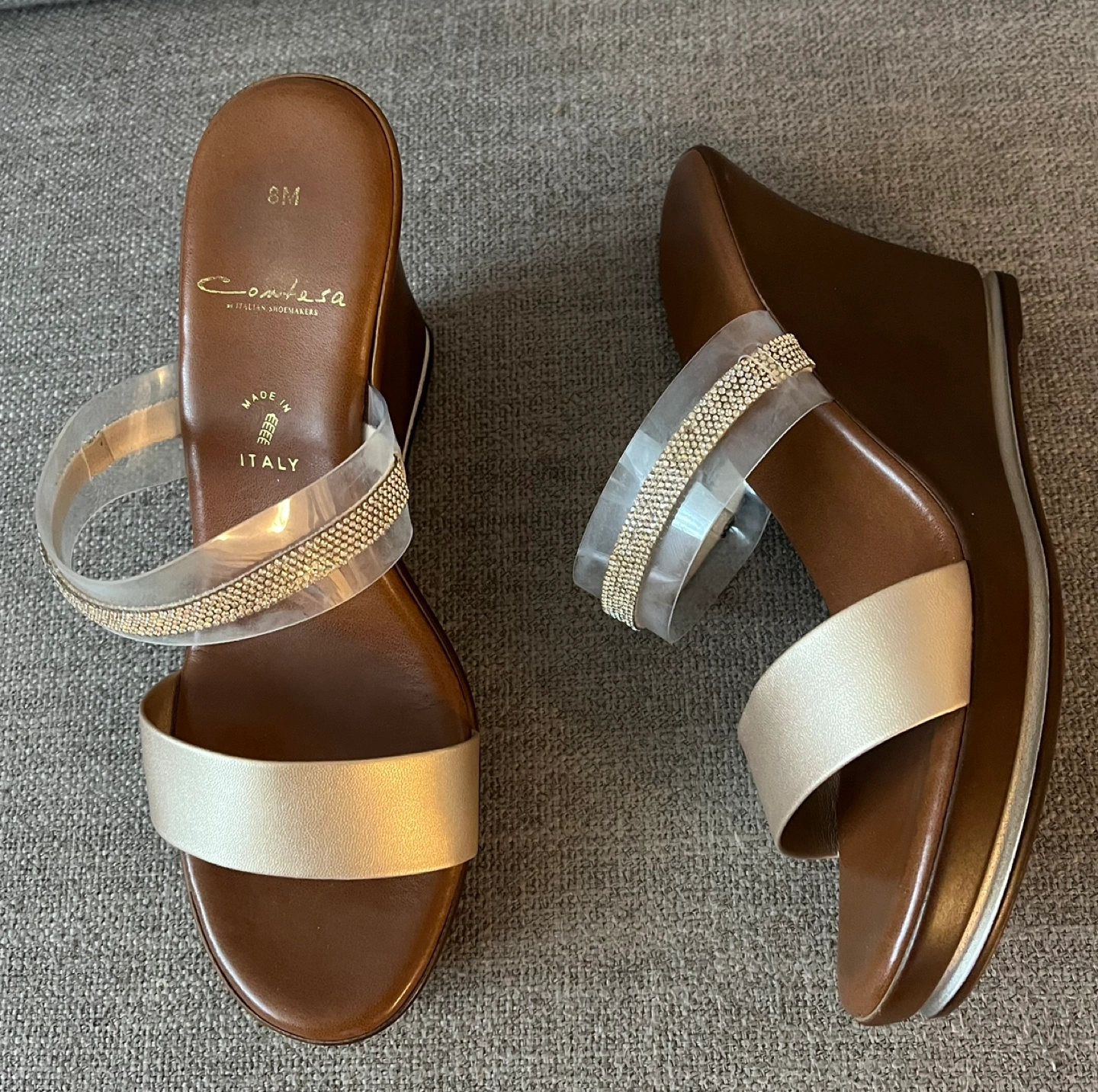 Beautiful Contesa wedge sandals Women Size 8M Made in Italy Clear straps with rhinestone detailing Excellent condition Pick up Bloor and Islington Etobicoke
