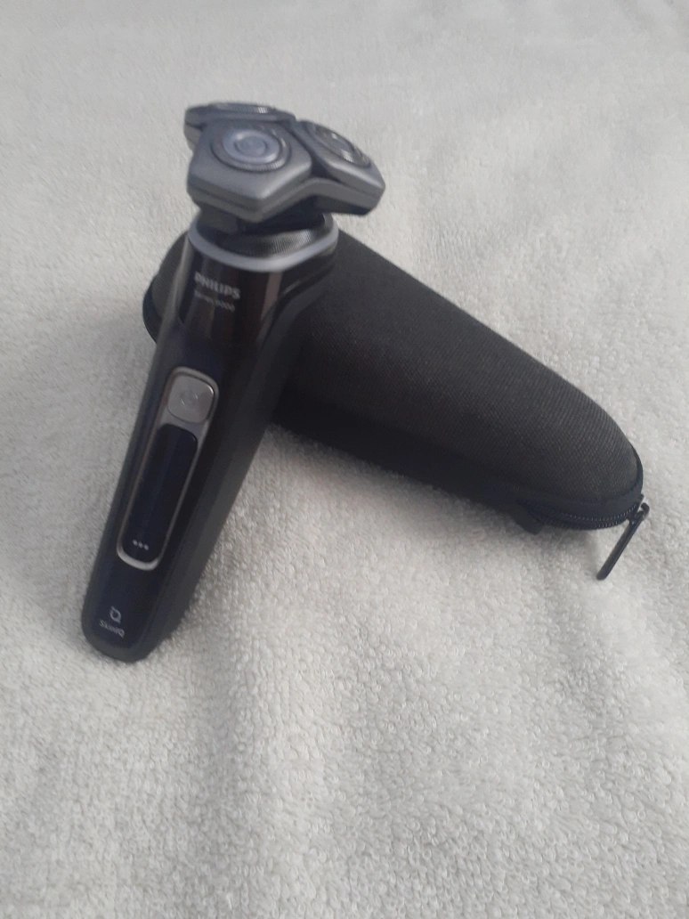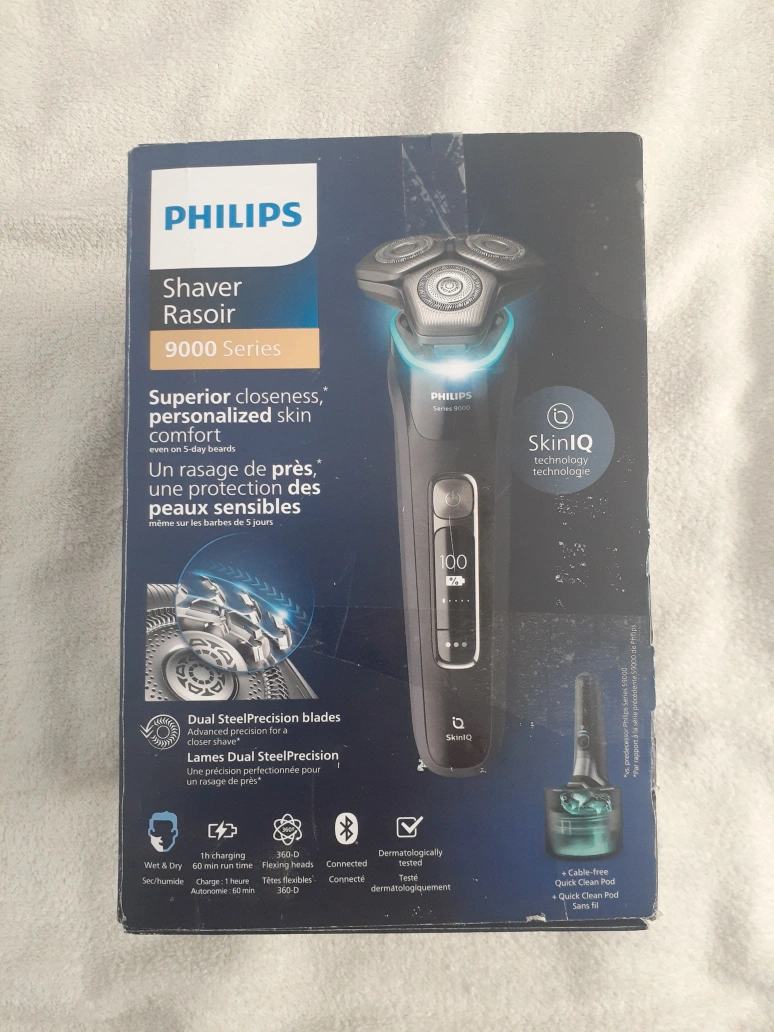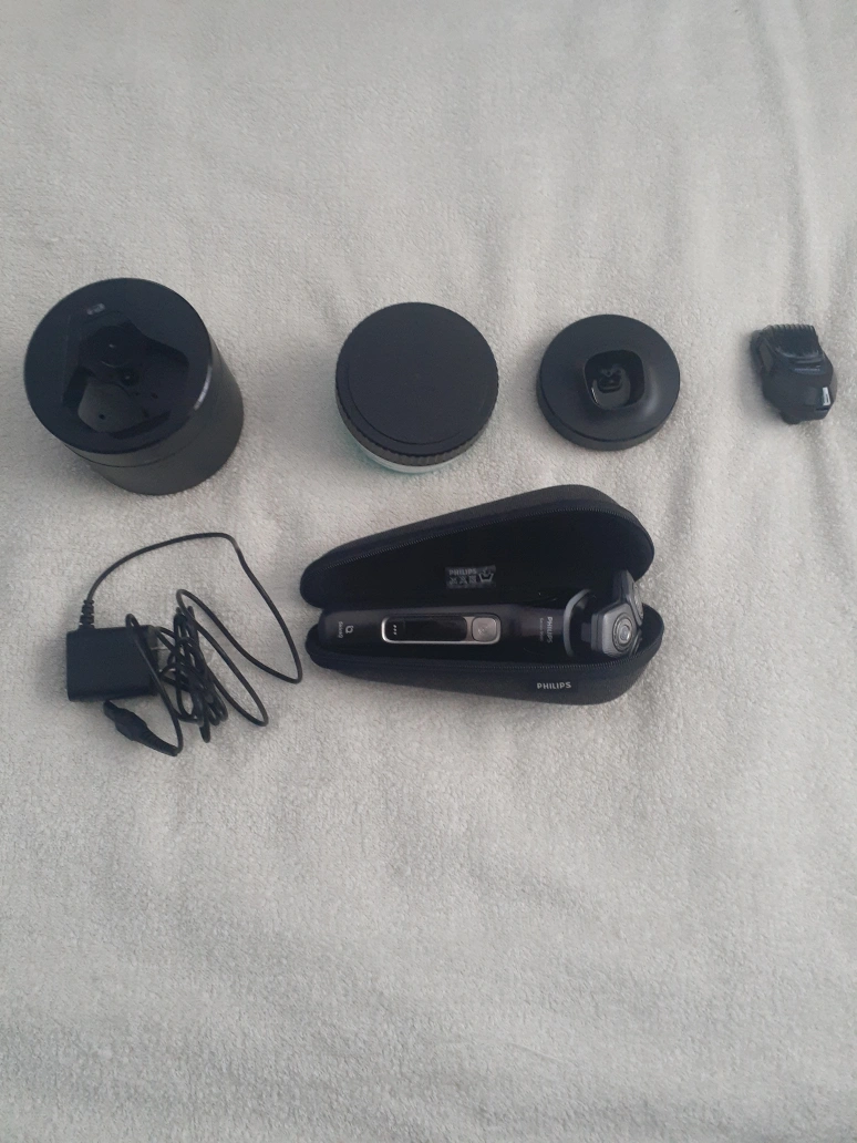 Philips 9000 Series electric shaver. Includes charging stand, cleaning pod, travel case, and additional accessories. SkinIQ technology. Dual SteelPrecision blades. Wet & dry use. Excellent condition.