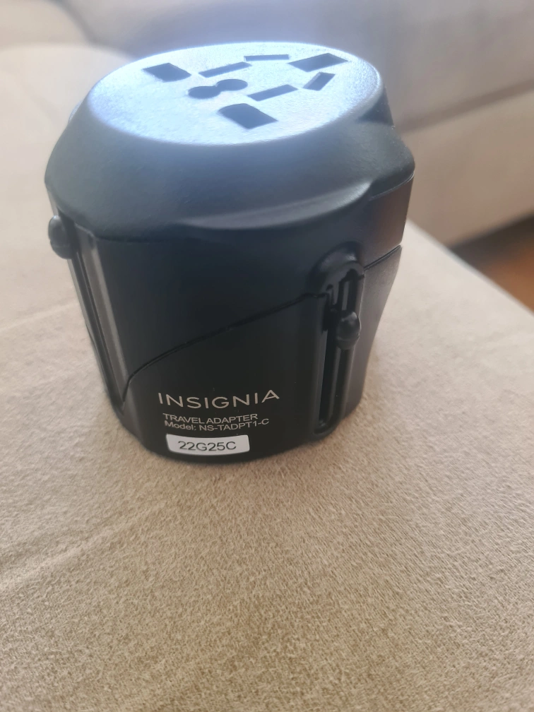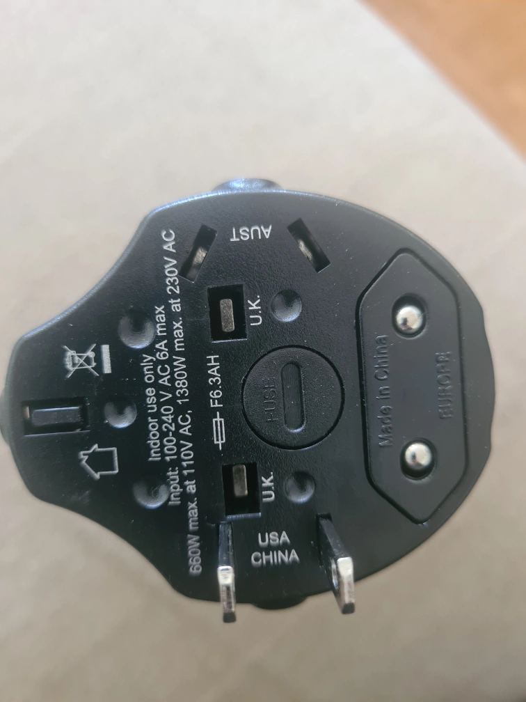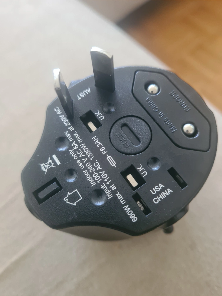 Black travel adapter. Multiple plugs (eqipped for travel in Europe).Compact design. Made in China.
