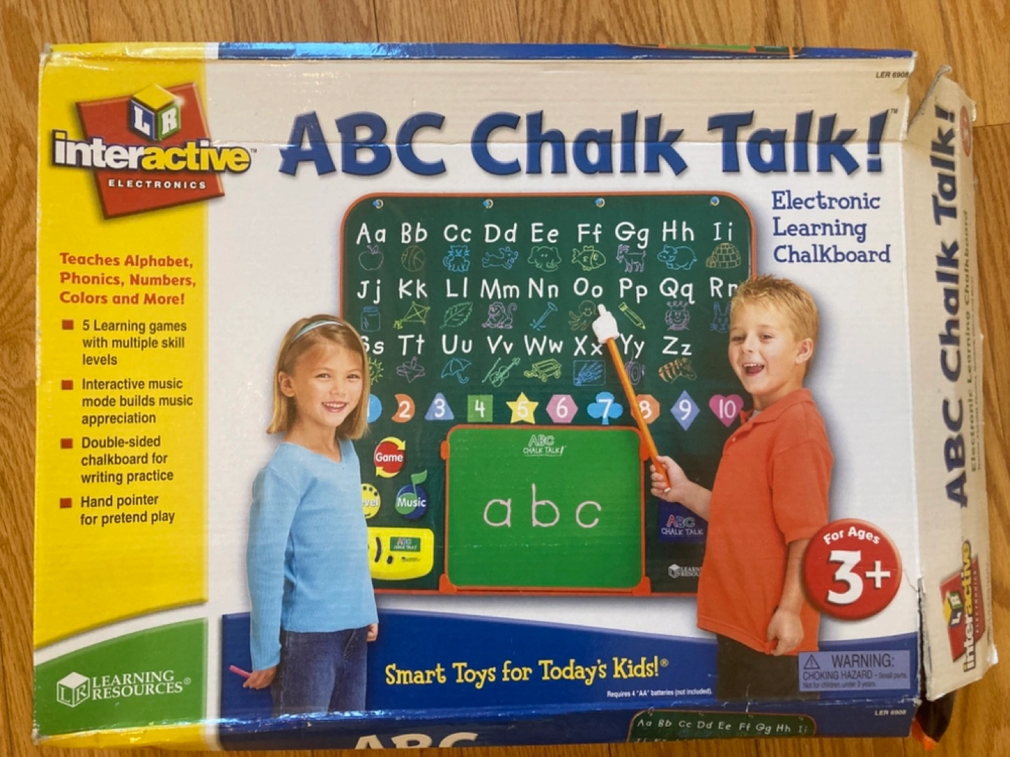 Electronic learning chalkboard. Teaches alphabet, phonics, numbers, colours and more. Five learning games with multiple skill levels. Interactive music mode builds appreciation. Double-sided chalkboard for writing practice. Hand pointer for pretend play. For ages 3+