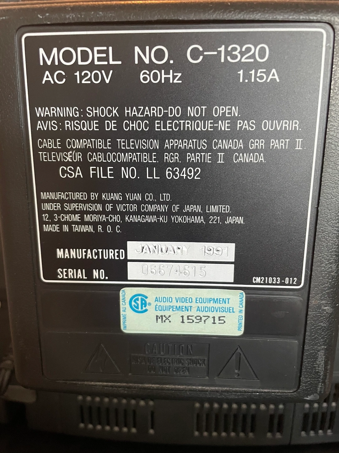 Vintage JVC MasterCommand television. Model number C-1320. Manufactured January 1991. Includes power cord. Analog television.