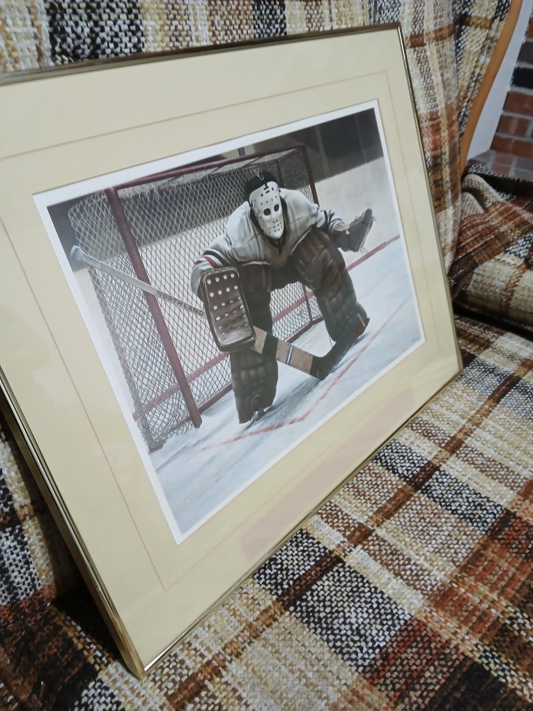 Framed print of a goalie in action. Gold frame. Matted. Excellent condition. there is one fading mark on the matte.