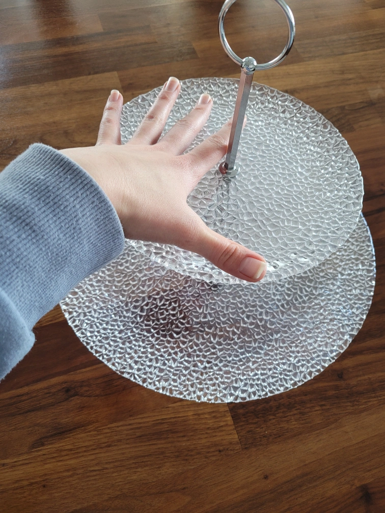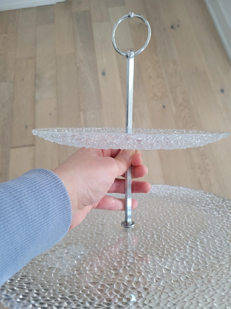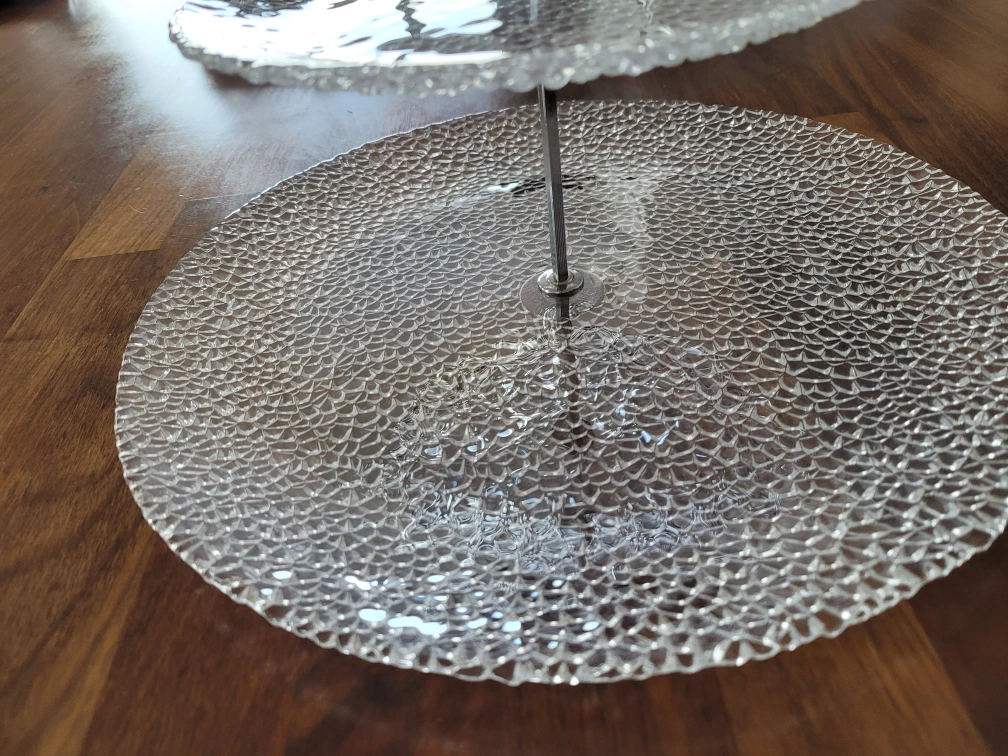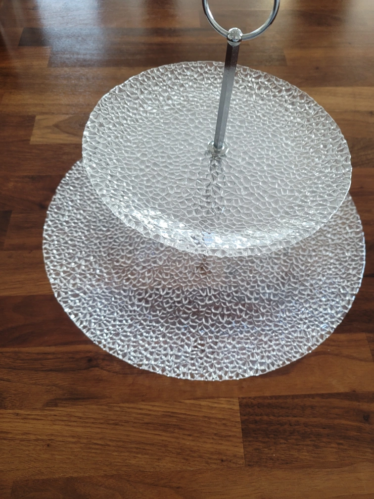 Elegant two-tiered glass cake stand. Features a textured glass design. Chrome stand. Perfect for parties or everyday use.