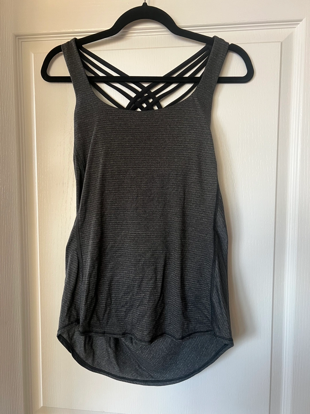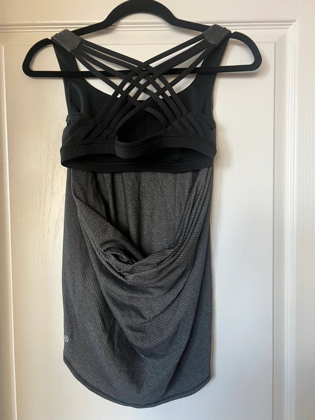 Grey + black tank from Lululemon Built-in bra Cross-back design Size 6 In excellent condition Lakeshore and parklawn Ossington and queen Willing to trade for items from my list