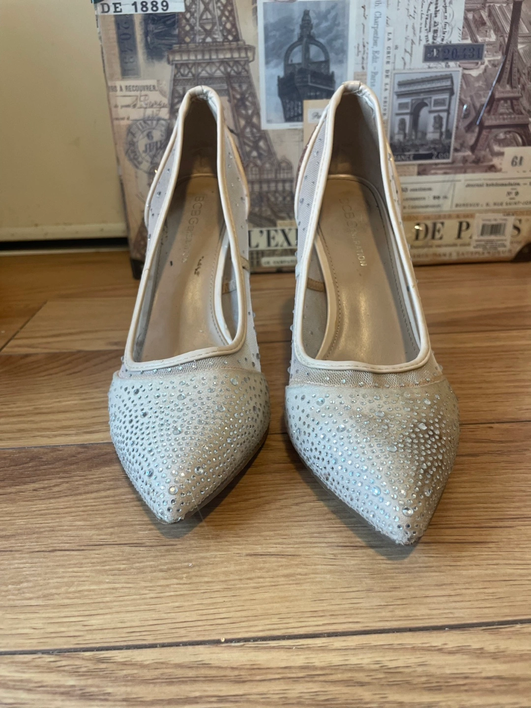 Nude-coloured heels with rose gold glitter accents. Mesh upper with rhinestone detailing. Pointed-toe design. High heels.