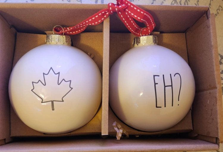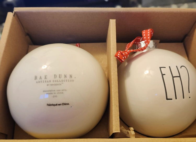Set of two Rae Dunn Christmas ornaments. Off-white glass ornaments. One features a maple leaf, the other says EH?. New in box.