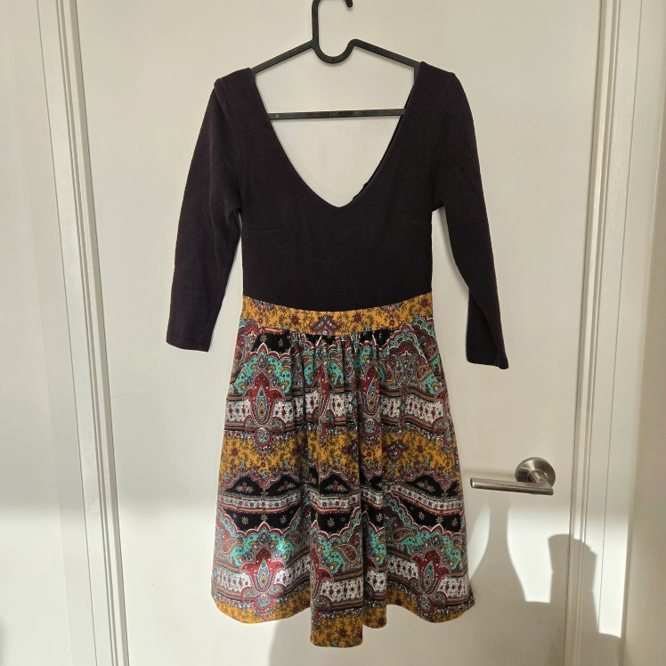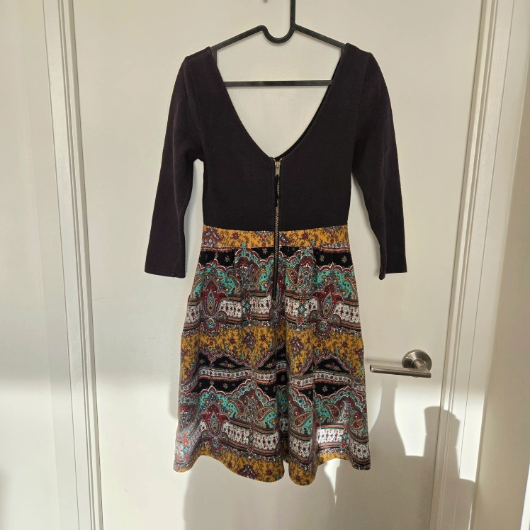 Stunning dress. Black bodice, colourful patterned skirt. Three-quarter sleeves. Back zipper. A-line silhouette. Perfect for any occasion.