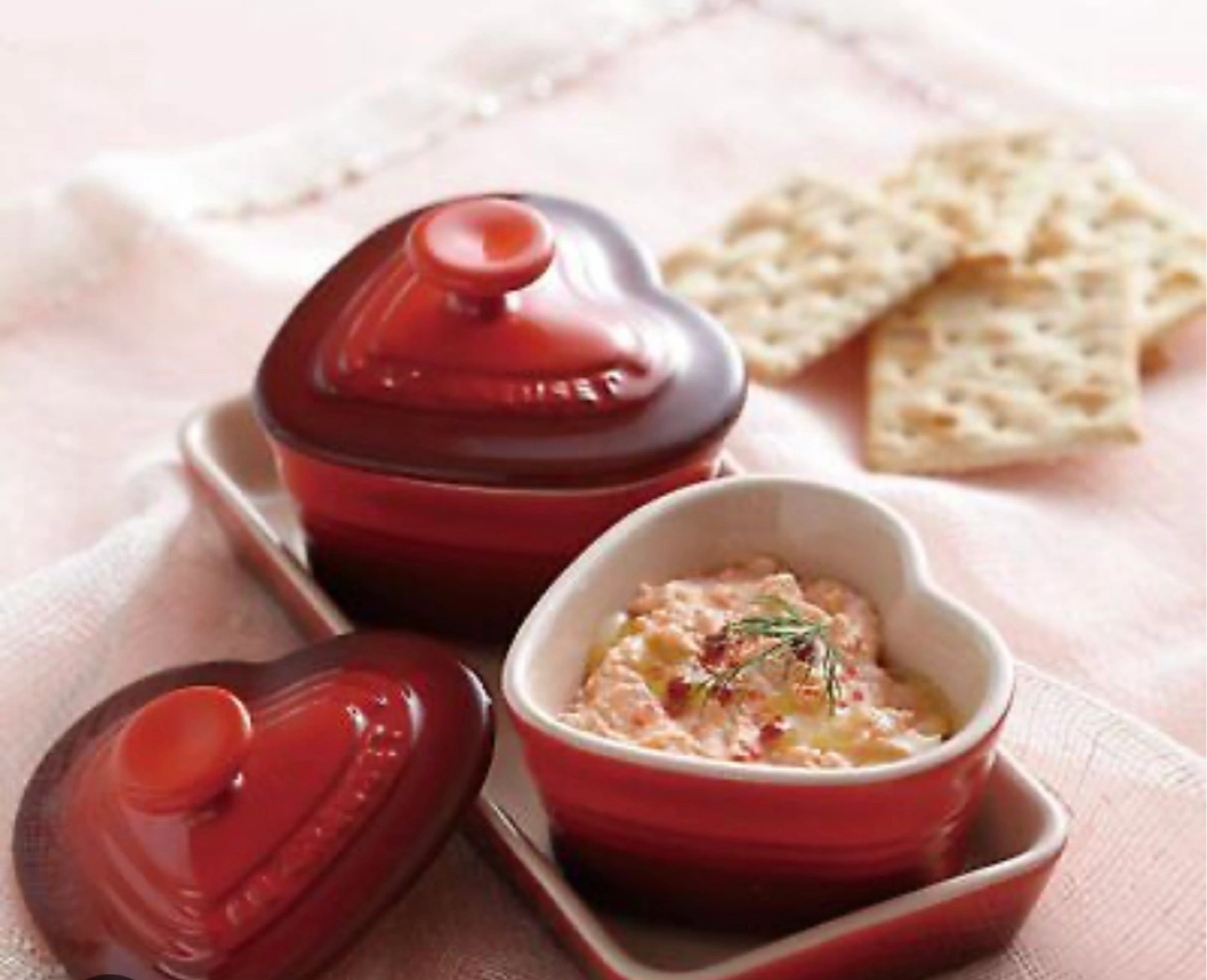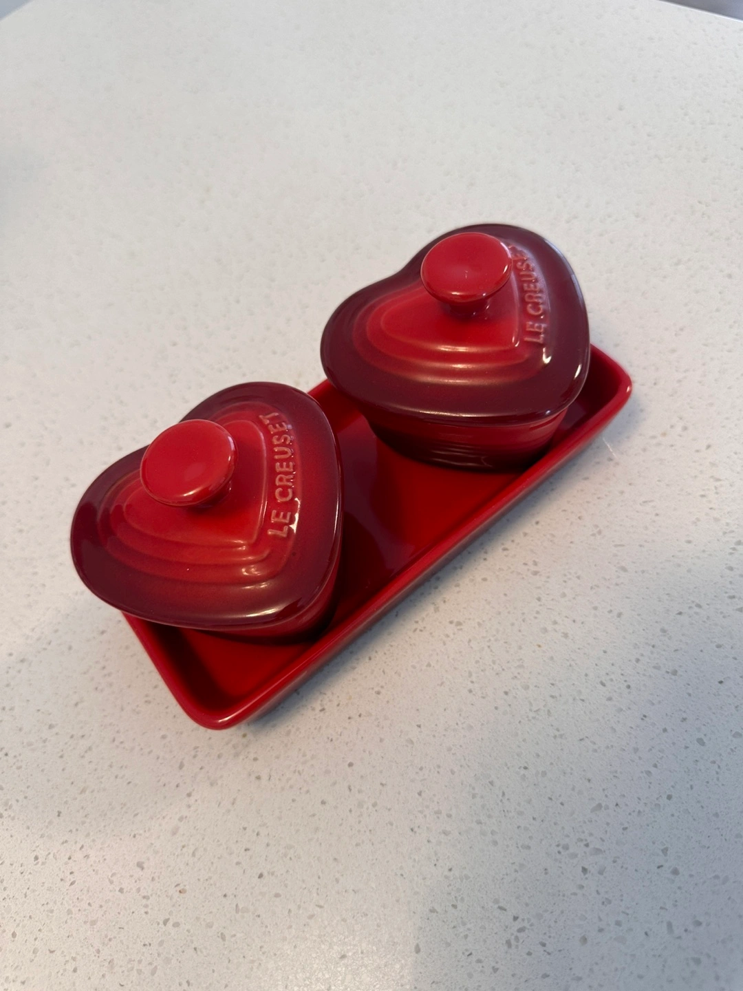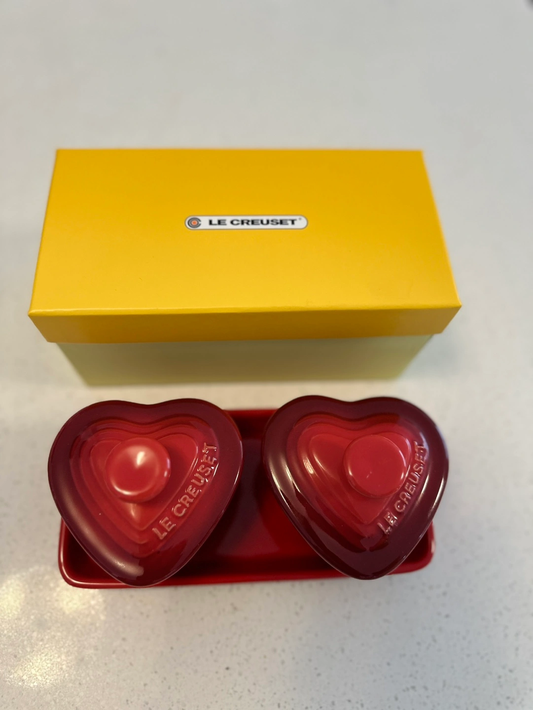 ** Hard to Find ** Limited Edition Le Creuset Cerise Heart Cocotte Ramekins w/ Tray - Set of 2 The Le Creuset Miniature Ramekins D'Amour Set features charming heart-shaped stoneware These ramekins are perfect for individual servings or as a decorative accent. Thank you .