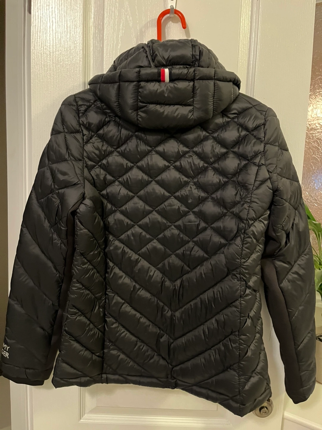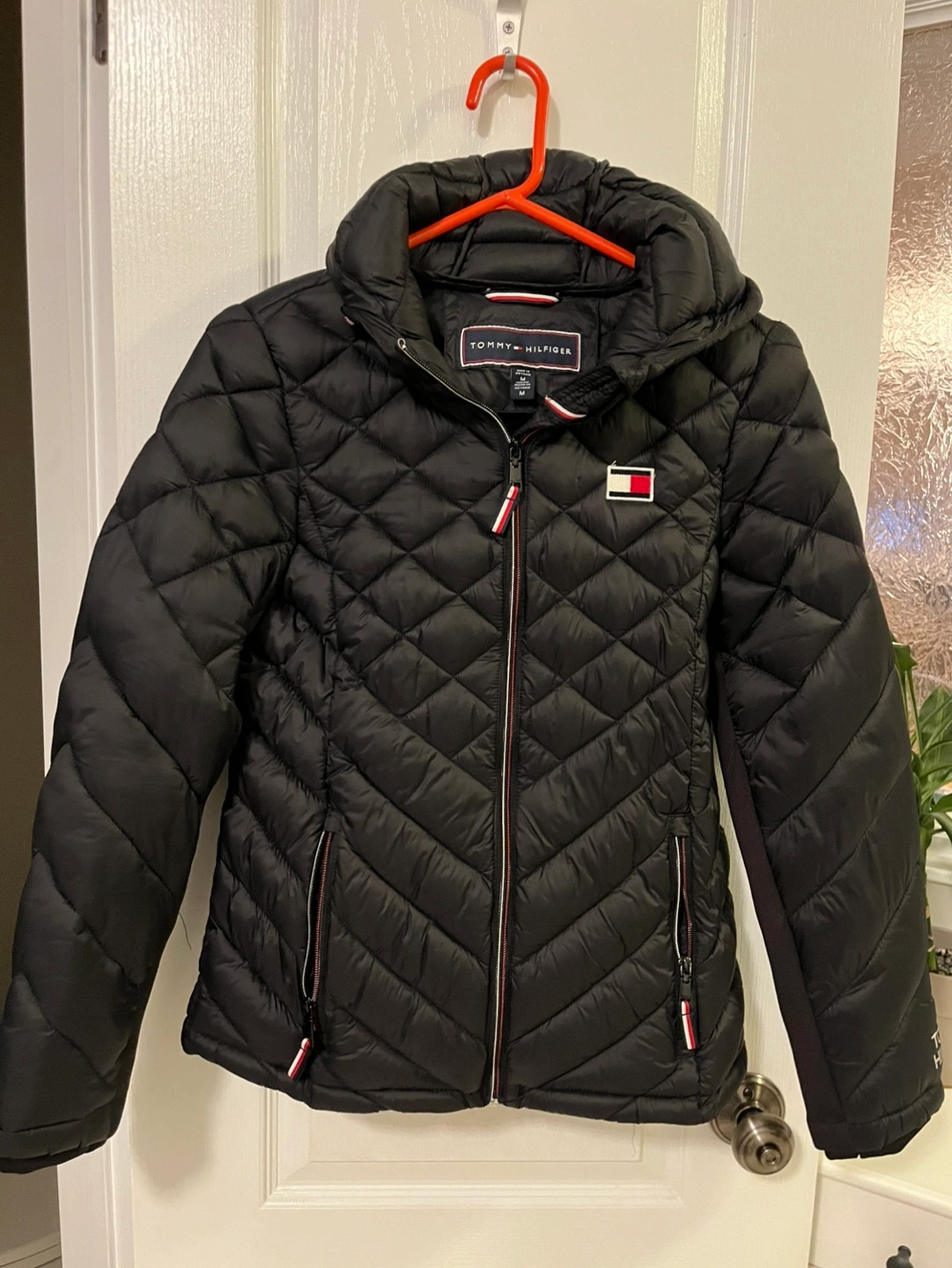 Women's black puffer jacket. Size M. Features a hood, zip closure, and quilted design. Long sleeves. Side pockets. PICK UP ONLY