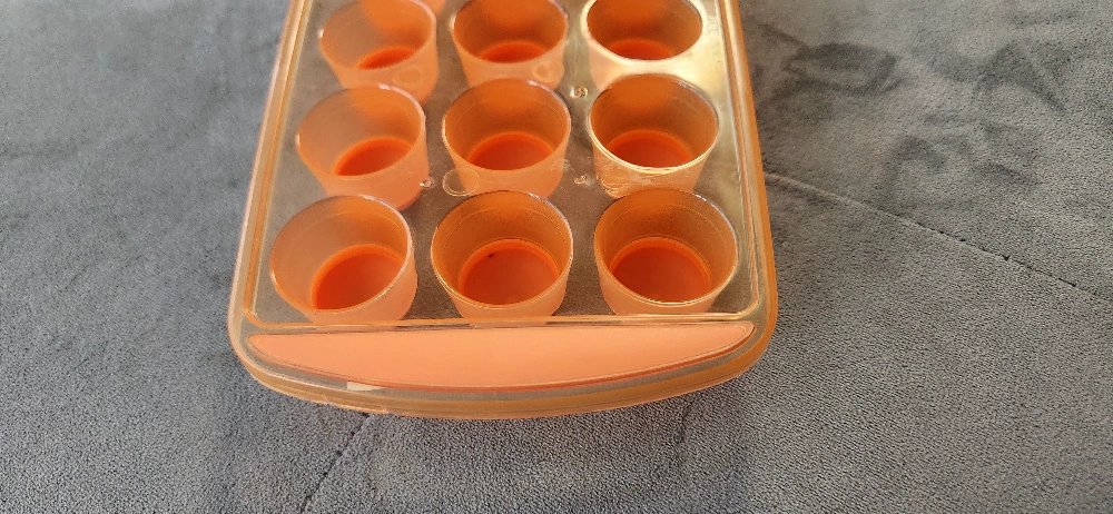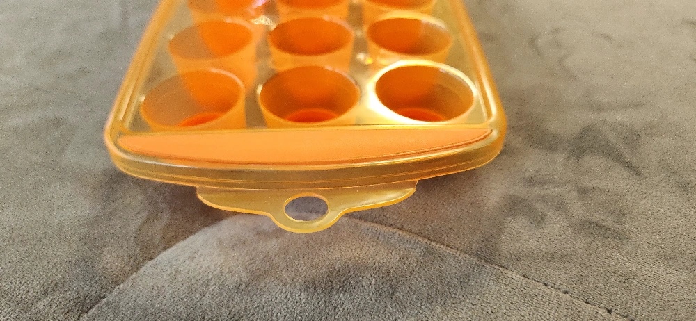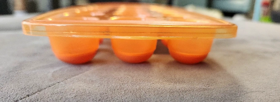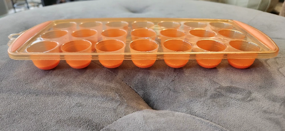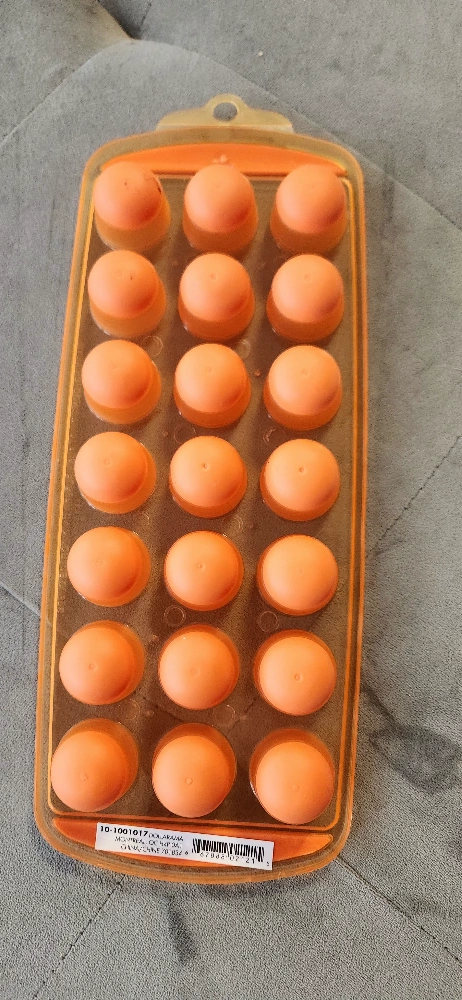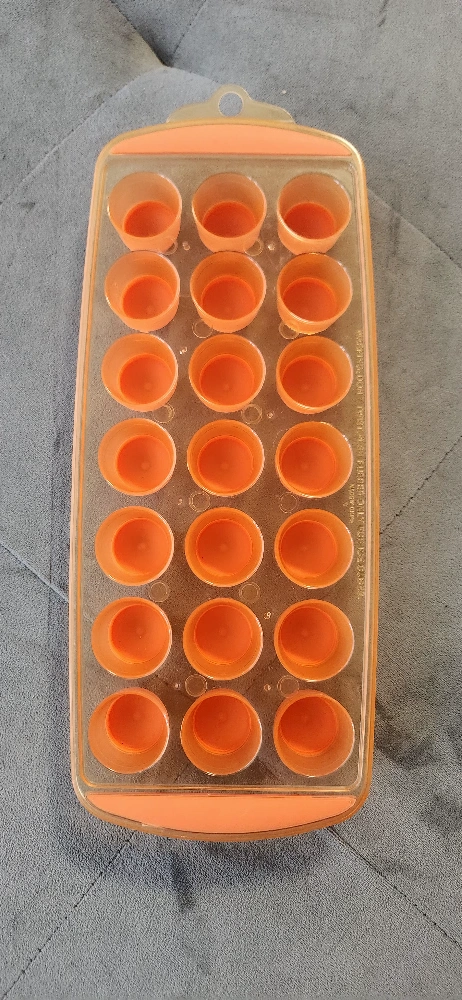 Orange silicone and plastic ice cube tray. Twenty one individual round molds. Features convenient handles on each end and hook for hanging when not in use. Great for making ice cubes or freezing other liquids. Easy to remove cubes with the soft silicone bottoms.
