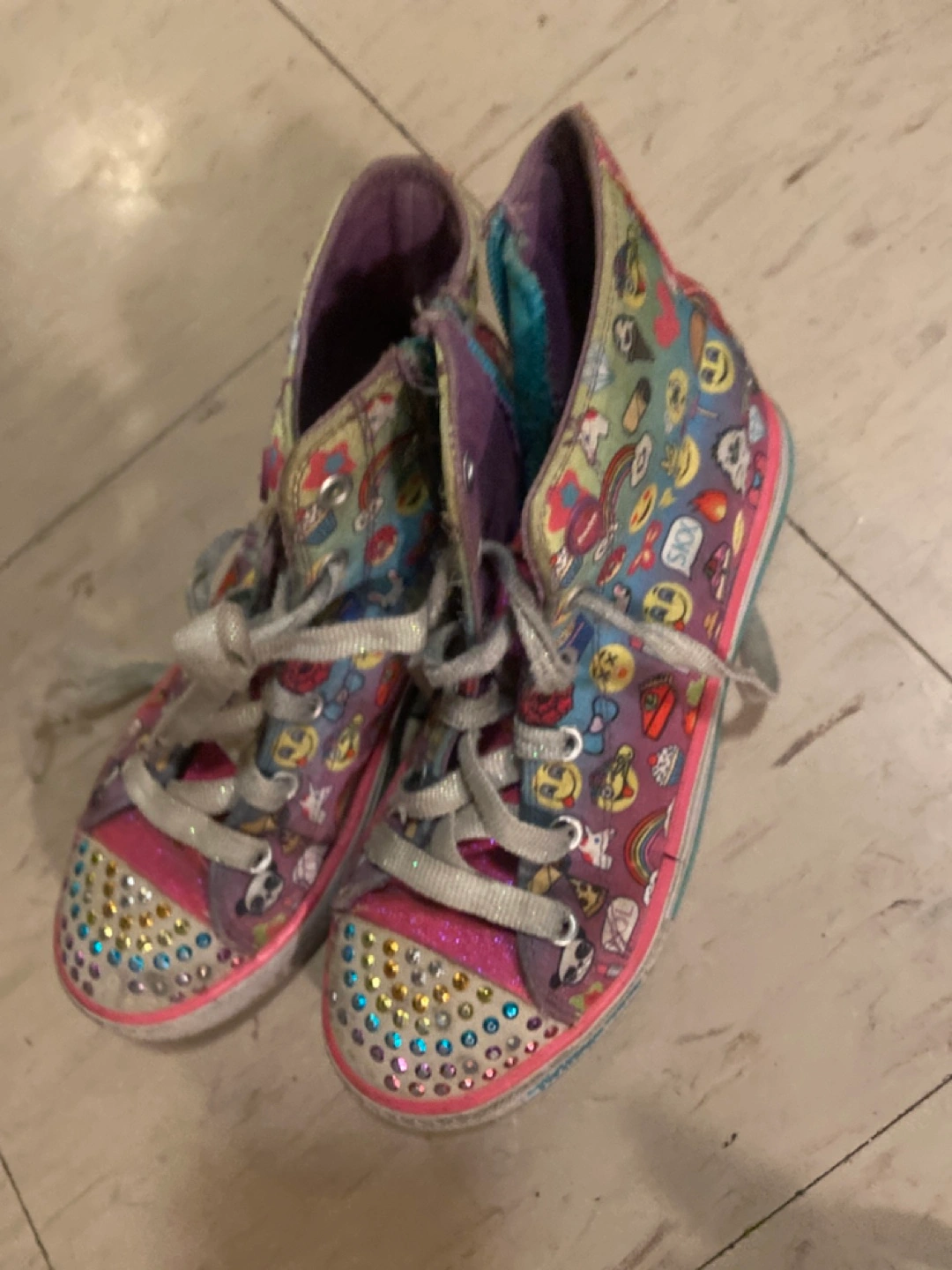 Cute high-top sneakers. Multicoloured design. Features glitter and rhinestones. Good for casual wear.